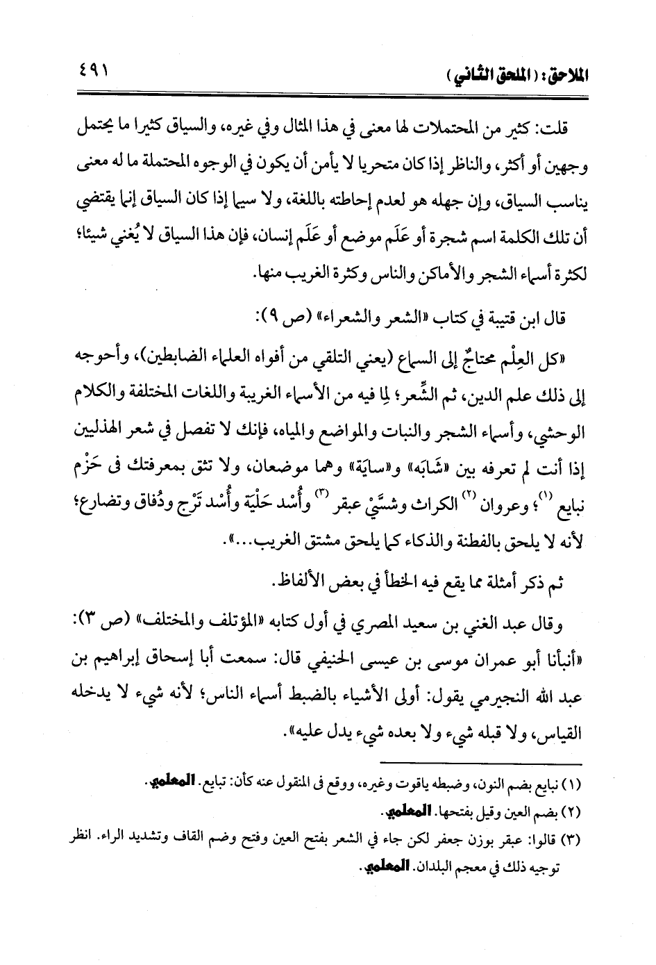 قلت: كثير من المحتملات لها معنى في هذا المثال وفي غيره، والسياق كثيرا ما يحتمل وجهين أو أكثر، والناظر إذا كان متحريا لا يأمن أن يكون في الوجوه المحتملة ما له معنى يناسب السياق، وإن جهله هو لعدم إحاطته باللغة، ولا سيما إذا كان السياق إنما يقتضي أن تلك الكلمة اسم شجرة أو عَلَم موضع أو عَلَم إنسان، فإن هذا السياق لا يُغني شيئا؛ لكثرة أسماء الشجر والأماكن والناس وكثرة الغريب منها.