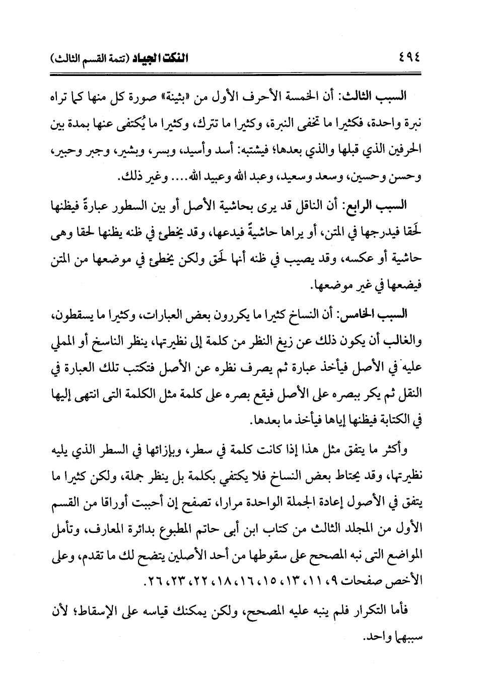 وأكثر ما يتفق مثل هذا إذا كانت كلمة في سطر، وبإزائها في السطر الذي يليه نظيرتها، وقد يحتاط بعض النساخ فلا يكتفي بكلمة بل ينظر جملة، ولكن كثيرًا ما يتفق في الأصول إعادة الجملة الواحدة مرارًا، تصفح إن أحببت أوراقا من القسم الأول من المجلد الثالث من كتاب ابن أبي حاتم المطبوع بدائرة المعارف، وتأمل المواضع التي نبه المصحح على سقوطها من أحد الأصلين يتضح لك ما تقدم، وعلى الأخص صفحات 9، 11، 13، 15، 16، 18، 22، 23، 26.
