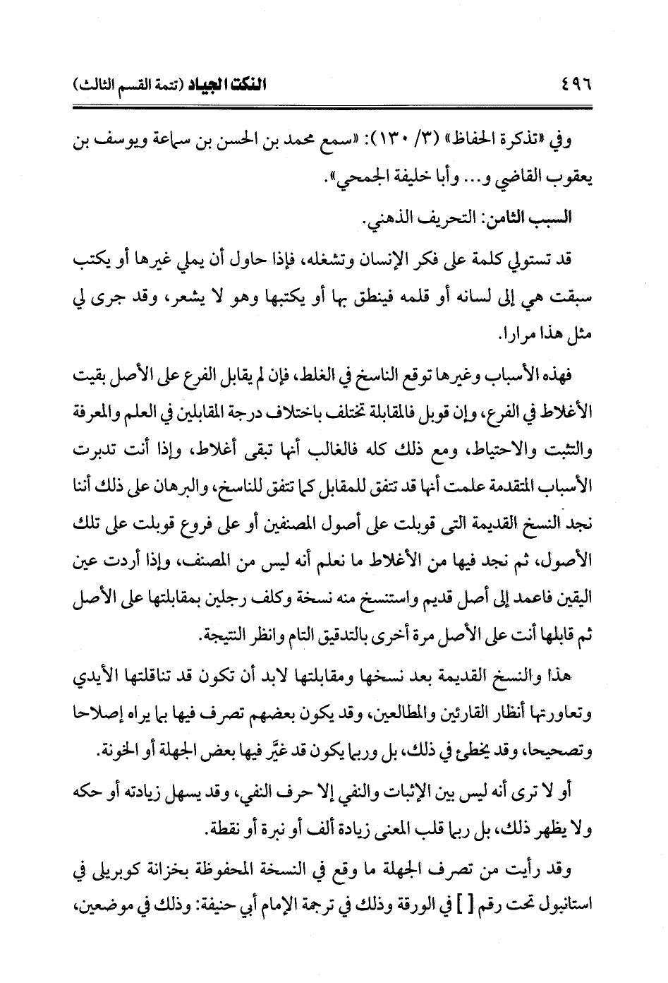 فهذه الأسباب وغيرها توقع الناسخ في الغلط، فإن لم يقابل الفرع على الأصل بقيت الأغلاط في الفرع، وإن قوبل فالمقابلة تختلف باختلاف درجة المقابلين في العلم والمعرفة والتثبت والاحتياط، ومع ذلك كله فالغالب أنها تبقى أغلاط، وإذا أنت تدبرت الأسباب المتقدمة علمت أنها قد تتفق للمقابل كما تتفق للناسخ، والبرهان على ذلك أننا نجد النسخ القديمة التي قوبلت على أصول المصنفين أو على فروع قوبلت على تلك الأصول، ثم نجد فيها من الأغلاط ما نعلم أنه ليس من المصنف، وإذا أردت عين اليقين فاعمد إلى أصل قديم واستنسخ منه نسخة وكلف رجلين بمقابلتها على الأصل ثم قابلها أنت على الأصل مرة أخرى بالتدقيق التام وانظر النتيجة.