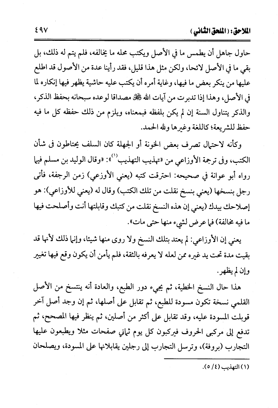 وكأنه لاحتمال تصرف بعض الخونة أو الجهلة كان السلف يحتاطون في شأن الكتب، وفي ترجمة الأوزاعي من "تهذيب التهذيب (¬1) ": "وقال الوليد بن مسلم فيما رواه أبو عوانة في صحيحه: احترقت كتبه (يعني الأوزعي) زمن الرجفة، فأتى رجل بنسخها (يعني بنسخ نقلت من تلك الكتب) وقال له (يعني للأوزاعي): هو إصلاحك بيدك (يعني إن هذه النسخ نقلت من كتبك وقابلتها أنت وأصلحت فيها ما فيه مخالفة) فما عرض لشيء منها حتى مات".