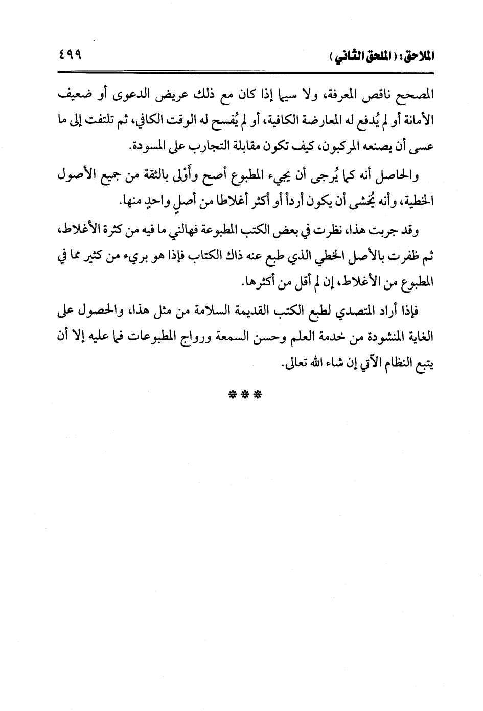 فإذا أراد المتصدي لطبع الكتب القديمة السلامة من مثل هذا، والحصول على الغاية المنشودة من خدمة العلم وحسن السمعة ورواج المطبوعات فما عليه إلا أن يتبع النظام الآتي إن شاء الله تعالى.