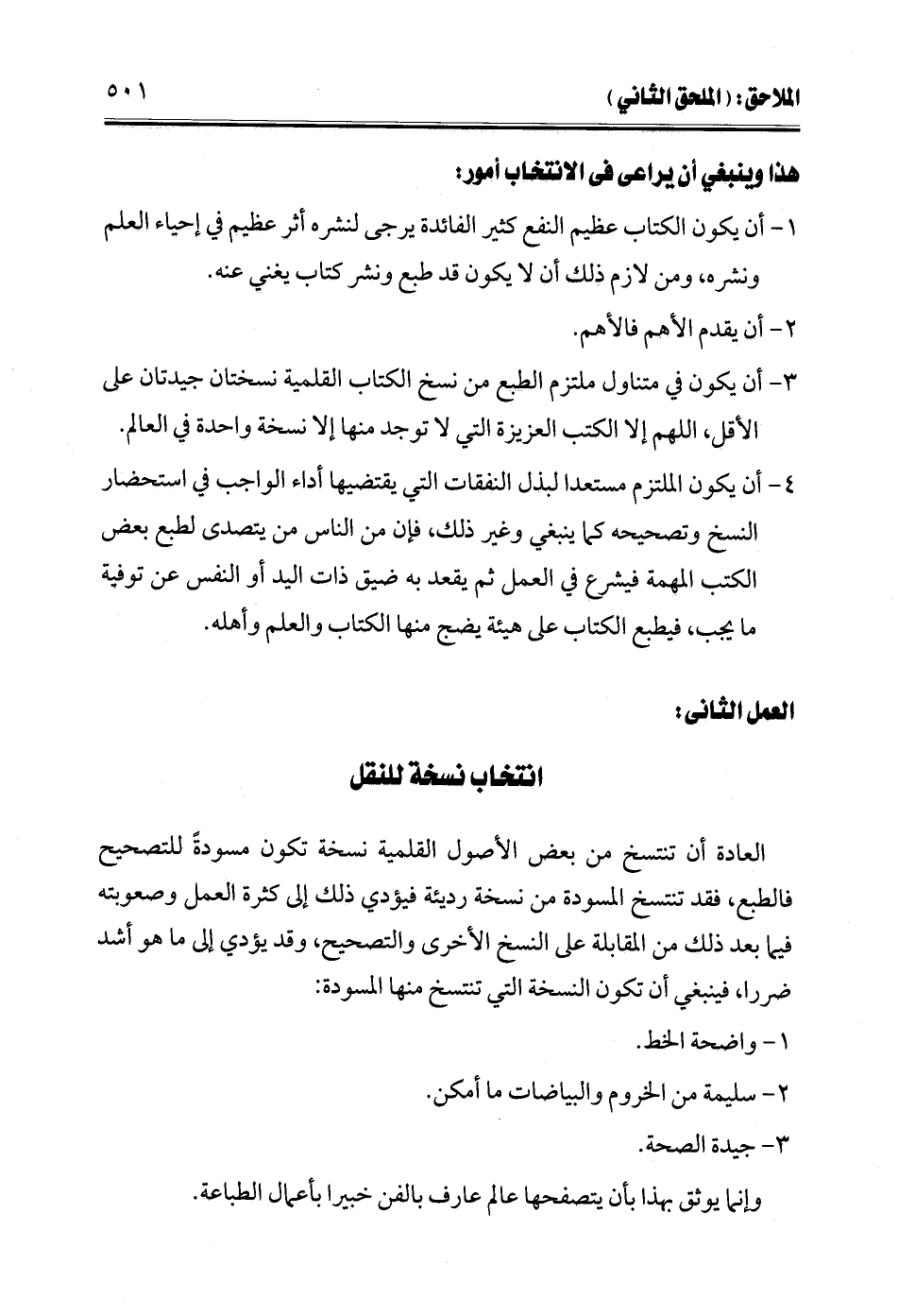 3 - أن يكون في متناول ملتزم الطبع من نسخ الكتاب القلمية نسختان جيدتان على الأقل، اللهم إلا الكتب العزيزة التي لا توجد منها إلا نسخة واحدة في العالم.