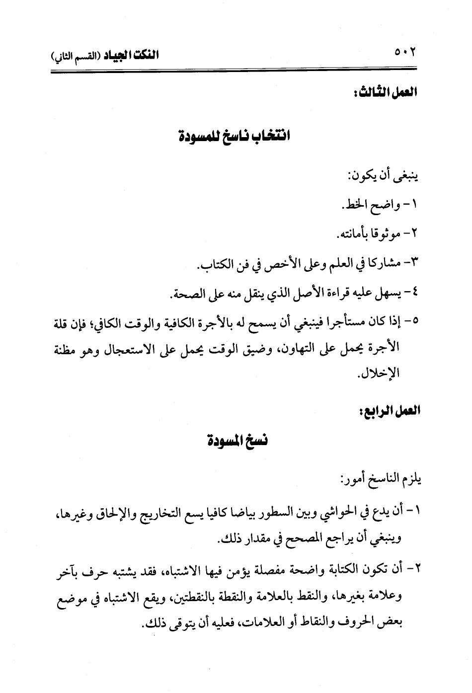 1 - أن يدع في الحواشي وبين السطور بياضا كافيًا يسع التخاريج والإلحاق وغيرها، وينبغي أن يراجع المصحح في مقدار ذلك.