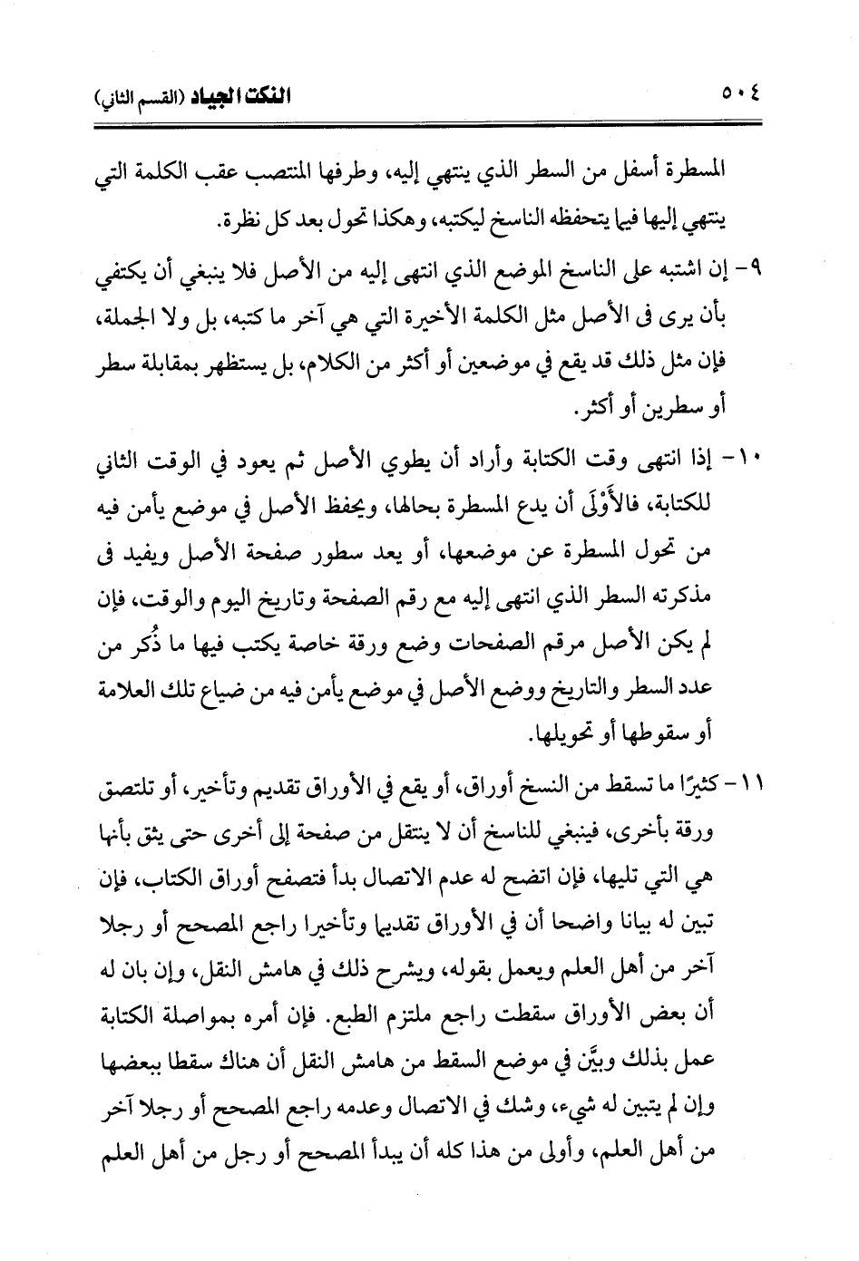 9 - إن اشتبه على الناسخ الموضع الذي انتهى إليه من الأصل فلا ينبغي أن يكتفي بأن يرى في الأصل مثل الكلمة الأخيرة التي هي آخر ما كتبه، بل ولا الجملة، فإن مثل ذلك قد يقع في موضعين أو أكثر من الكلام، بل يستظهر بمقابلة سطر أو سطرين أو أكثر.