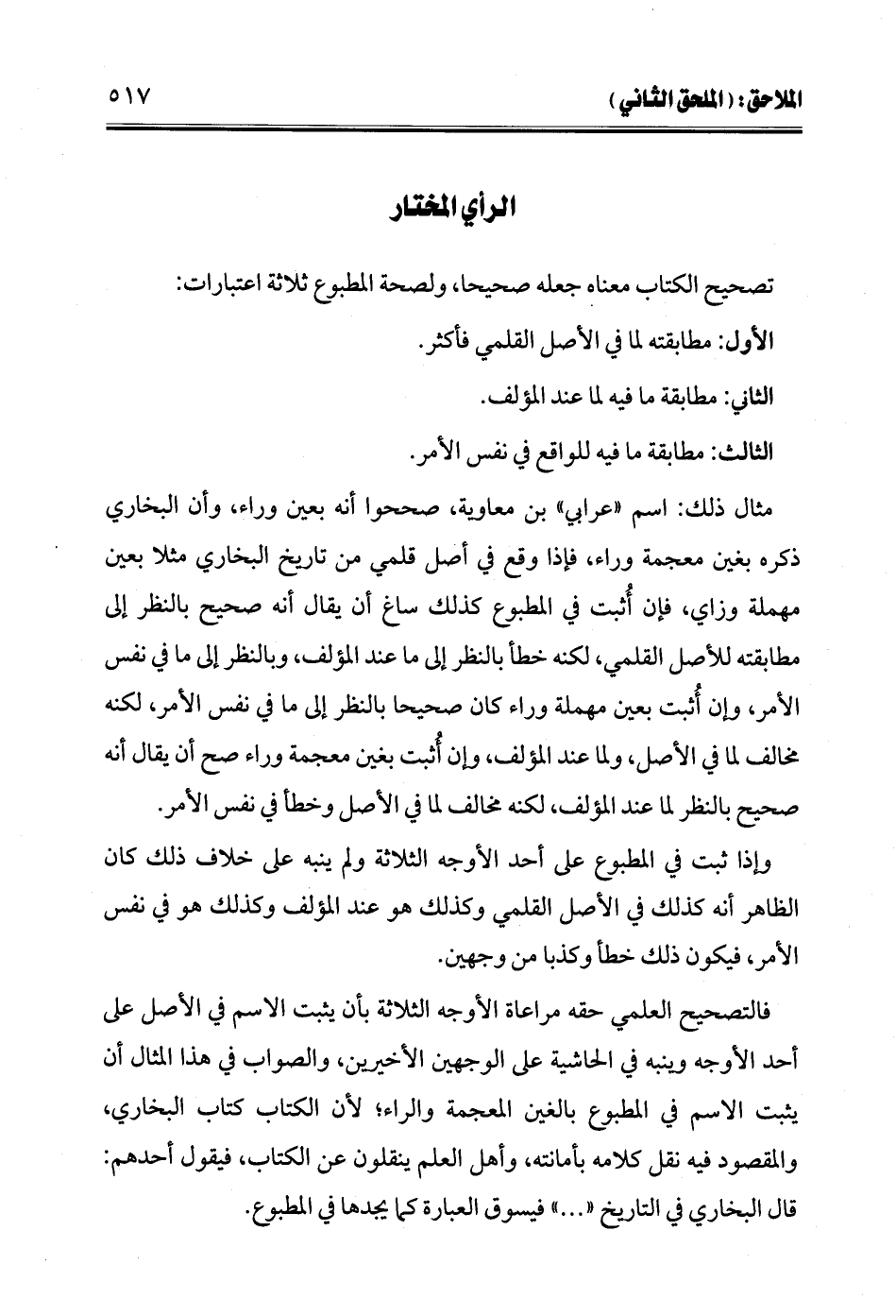 فالتصحيح العلمي حقه مراعاة الأوجه الثلاثة بأن يثبت الاسم في الأصل على أحد الأوجه وينبه في الحاشية على الوجهين الأخيرين، والصواب في هذا المثال أن يثبت الاسم في المطبوع بالغين المعجمة والراء؛ لأن الكتاب كتاب البخاري، والمقصود فيه نقل كلامه بأمانته، وأهل العلم ينقلون عن الكتاب، فيقول أحدهم: قال البخاري في التاريخ " ... " فيسوق العبارة كما يجدها في المطبوع.