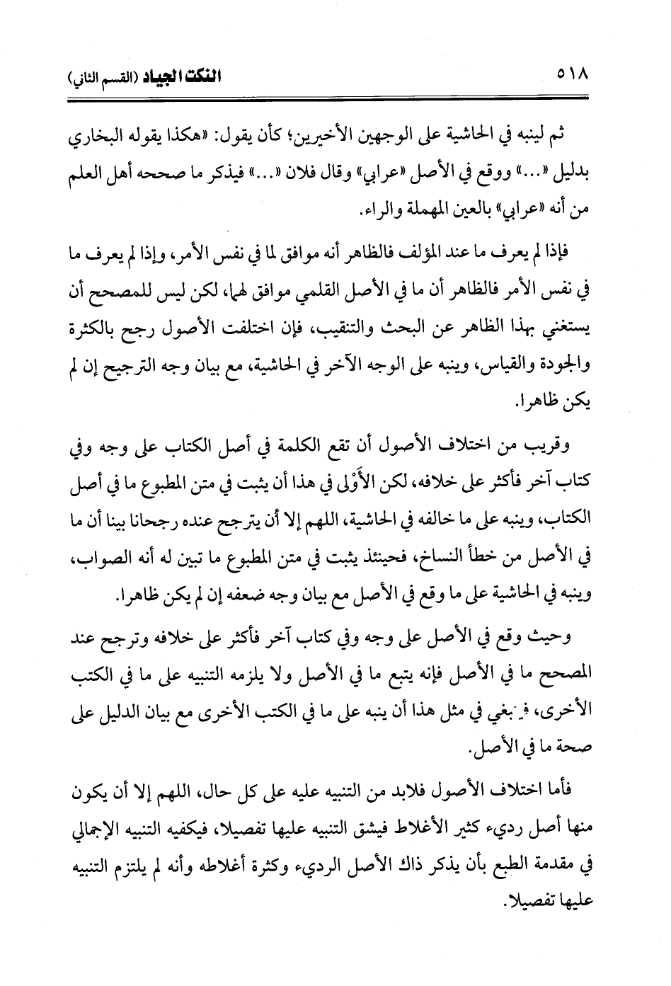 ثم لينبه في الحاشية على الوجهين الأخيرين؛ كأن يقول: "هكذا يقوله البخاري بدليل " ... " ووقع في الأصل "عرابي" وقال فلان " ... " فيذكر ما صححه أهل العلم من أنه "عرابي" بالعين المهملة والراء.