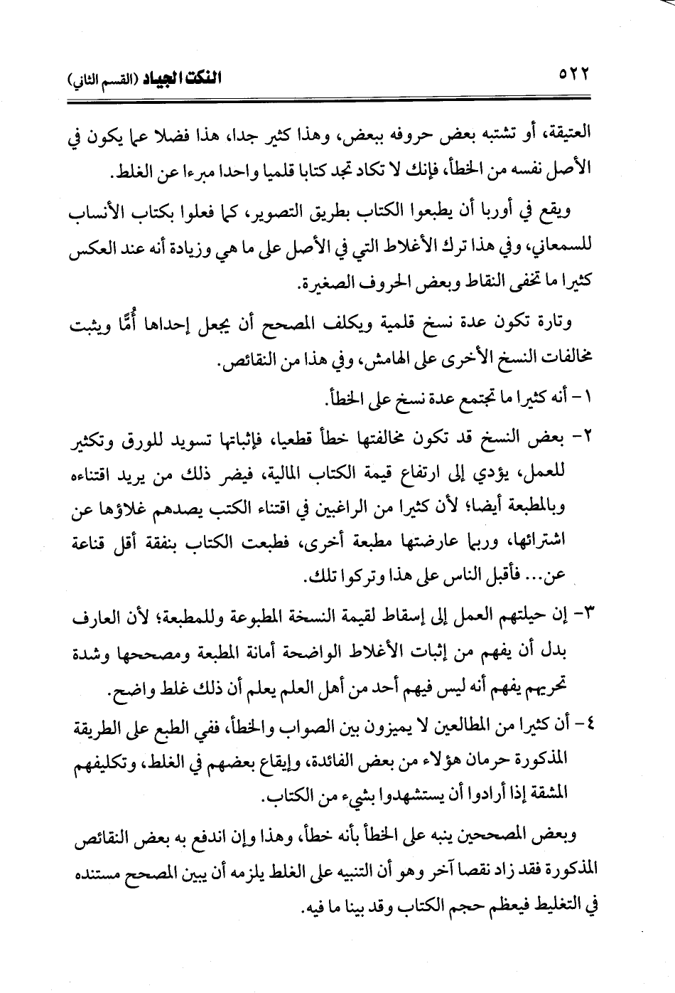 وبعض المصححين ينبه على الخطأ بأنه خطأ، وهذا وإن اندفع به بعض النقائص المذكورة فقد زاد نقصًا آخر وهو أن التنبيه على الغلط يلزمه أن يبين المصحح مستنده في التغليط فيعظم حجم الكتاب وقد بينا ما فيه.