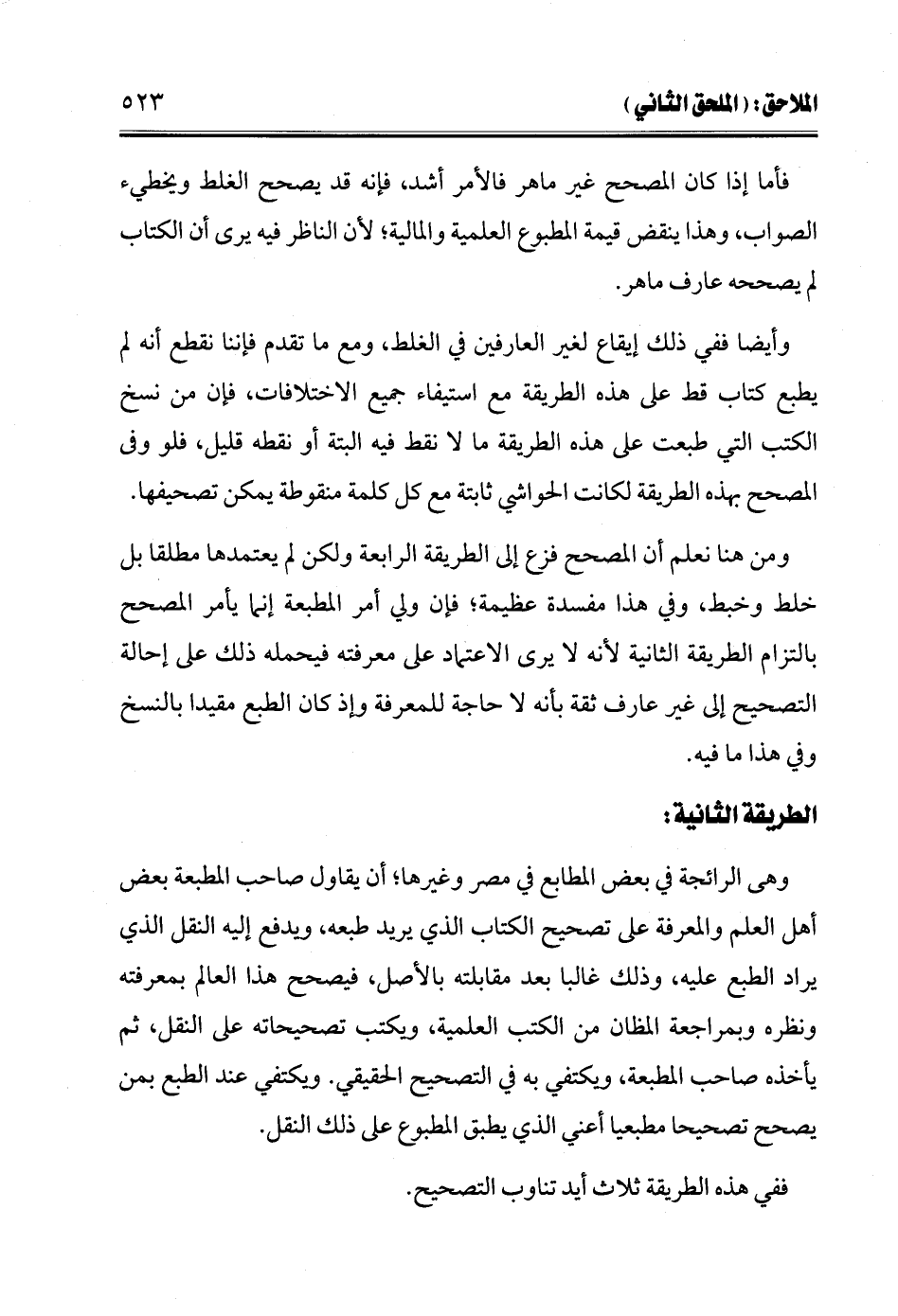 ومن هنا نعلم أن المصحح فزع إلى الطريقة الرابعة ولكن لم يعتمدها مطلقًا بل خلط وخبط، وفي هذا مفسدة عظيمة؛ فإن ولي أمر المطبعة إنما يأمر المصحح بالتزام الطريقة الثانية لأنه لا يرى الاعتماد على معرفته فيحمله ذلك على إحالة التصحيح إلى غير عارف ثقة بأنه لا حاجة للمعرفة وإذ كان الطبع مقيدًا بالنسخ وفي هذا ما فيه.