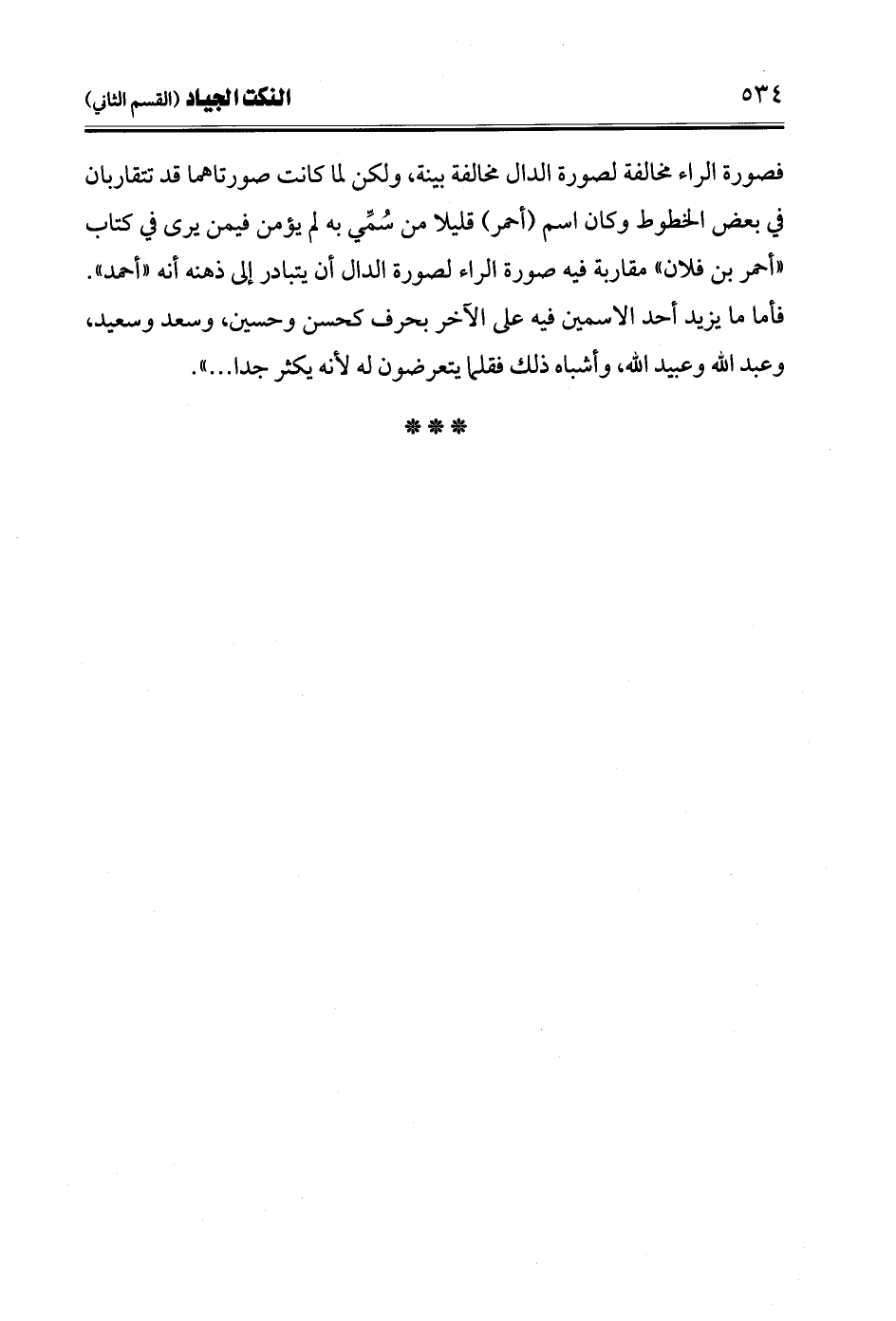 فصورة الراء مخالفة لصورة الدال مخالفة بينة, ولكن لما كانت صورتاهما قد تتقاربان في بعض الخطوط وكان اسم (أحمر) قليلًا من سُمِّي به لم يؤمن فيمن يرى في كتاب "أحمر بن فلان" مقاربة فيه صورة الراء لصورة الدال أن يتبادر إلى ذهنه أنه "أحمد". فأما ما يزيد أحد الاسمين فيه على الآخر بحرف كحسن وحسين، وسعد وسعيد، وعبد الله وعبيد الله، وأشباه ذلك فقلما يتعرضون له لأنه يكثر جدًّا ... ".