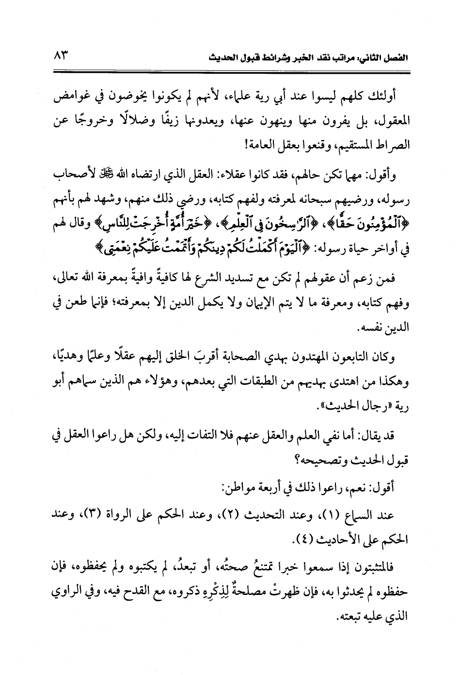 وأقول: مهما تكن حالهم، فقد كانوا عقلاء: العقل الذي ارتضاه الله عز وجل لأصحاب رسوله، ورضيهم سبحانه لمعرفته ولفهم كتابه، ورضي ذلك منهم، وشهد لهم بأنهم {الْمُؤْمِنُونَ حَقًّا}، {الرَّاسِخُونَ فِي الْعِلْمِ}، {خَيْرَ أُمَّةٍ أُخْرِجَتْ لِلنَّاسِ} وقال لهم في أواخر حياة رسوله: {الْيَوْمَ أَكْمَلْتُ لَكُمْ دِينَكُمْ وَأَتْمَمْتُ عَلَيْكُمْ نِعْمَتِي}.