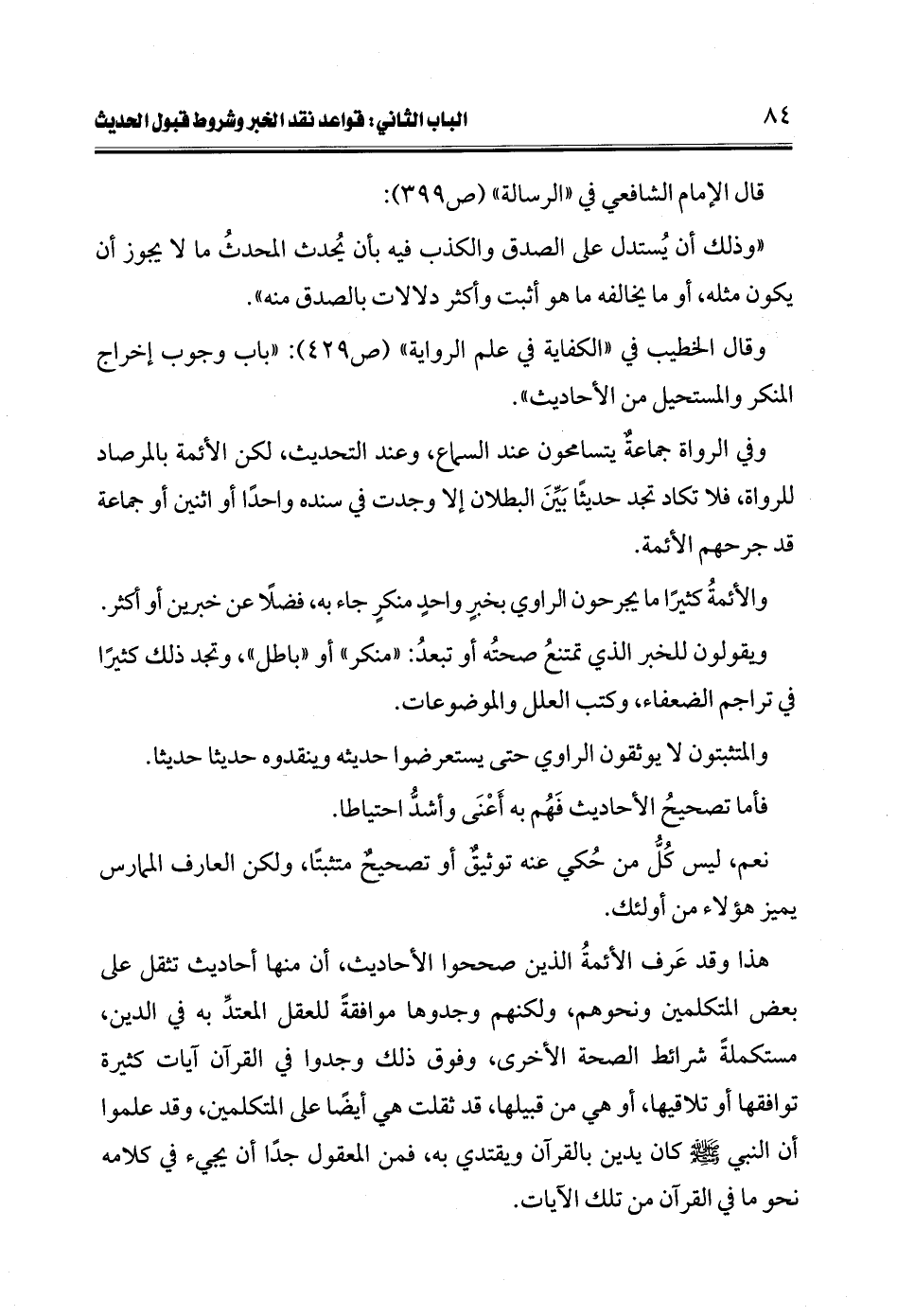 هذا وقد عَرف الأئمةُ الذين صححوا الأحاديث، أن منها أحاديث تثقل على بعض المتكلمن ونحوهم، ولكنهم وجدوها موافقةً للعقل المعتدِّ به في الدين، مستكملةً شرائط الصحة الأخرى، وفوق ذلك وجدوا في القرآن آيات كثيرة توافقها أو تلاقيها، أو هي من قبيلها، قد ثقلت هي أيضًا على المتكلمين، وقد علموا أن النبي -صلى الله عليه وسلم- كان يدين بالقرآن ويقتدي به، فمن المعقول جدًّا أن يجيء في كلامه نحو ما في القرآن من تلك الآيات.