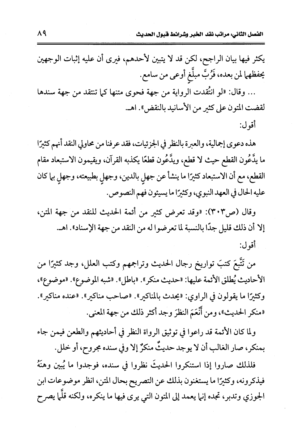 وقال (ص 303): "وقد تعرض كثير من أئمة الحديث للنقد من جهة المتن، إلا أن ذلك قليل جدًّا بالنسبة لما تعرضوا له من النقد من جهة الإسناد". اهـ.