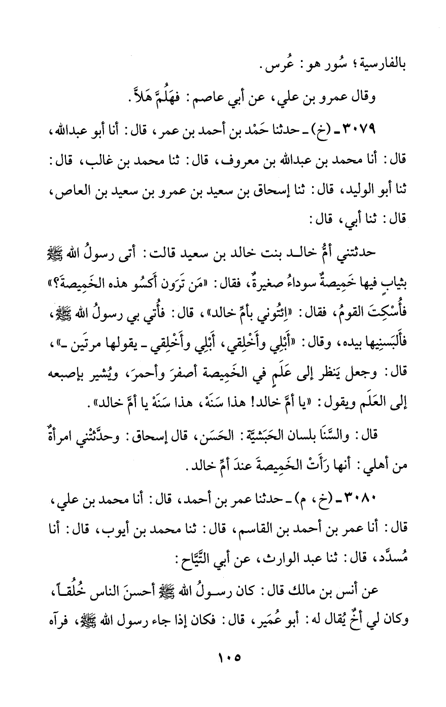 حدثتني أم خالد بنت خالد بن سعيد قالت: أتى رسول الله صلى الله عليه وسلم بثياب فيها خميصة سوداء صغيرة، فقال: ((من ترون أكسو هذه الخميصة؟)) فأسكت القوم، فقال: ((ائتوني بأم خالد))، قال: فأتي بي رسول الله صلى الله عليه وسلم، فألبسنيها بيده، وقال: ((أبلي وأخلقي، أبلي وأخلقي -يقولها مرتين-))، قال: وجعل ينظر إلى علم في الخميصة أصفر وأحمر، ويشير بإصبعه إلى العلم ويقول: ((يا أم خالد! هذا سنه، هذا سنه يا أم خالد)).