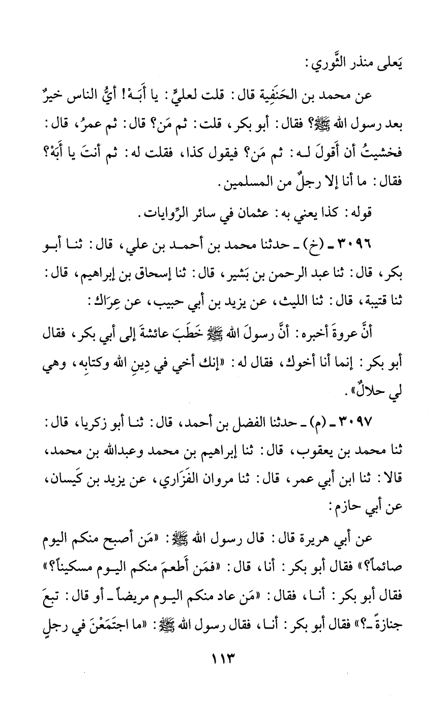 3097 - (م) - حدثنا الفضل بن أحمد، قال: ثنا أبو زكريا، قال: ثنا محمد بن يعقوب، قال: ثنا إبراهيم بن محمد وعبد الله بن محمد، قالا: ثنا ابن أبي عمر، قال: ثنا مروان الفزاري، عن يزيد بن كيسان، عن أبي حازم: