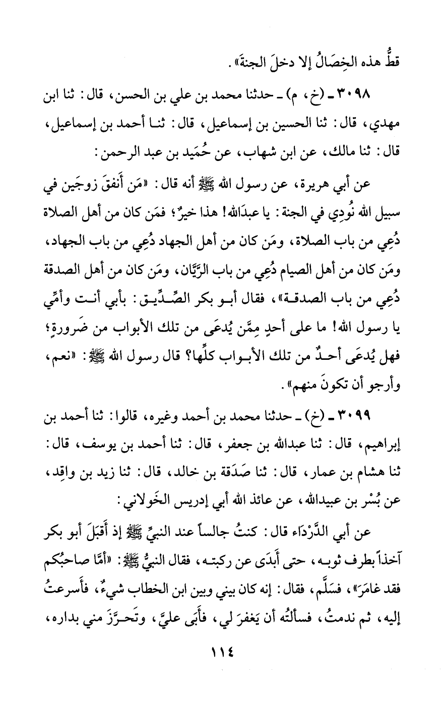 3098 - (خ، م) - حدثنا محمد بن علي بن الحسن، قال: ثنا ابن مهدي، قال: ثنا الحسين بن إسماعيل، قال: ثنا أحمد بن إسماعيل، قال: ثنا مالك، عن ابن شهاب، عن حميد بن عبد الرحمن: