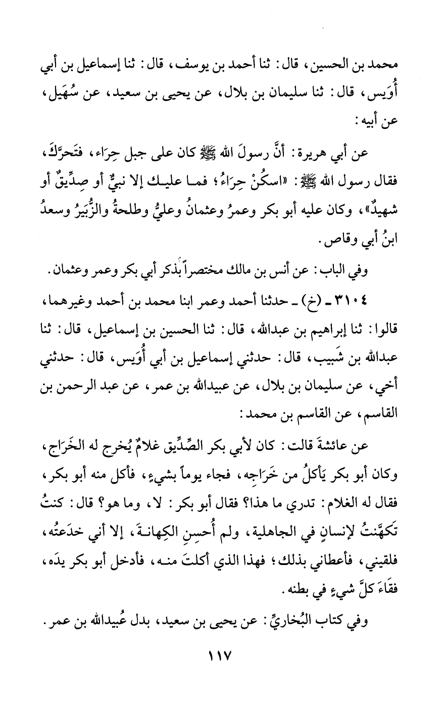 3104 - (خ) - حدثنا أحمد وعمر ابنا محمد بن أحمد وغيرهما، قالوا: ثنا إبراهيم بن عبد الله، قال: ثنا الحسين بن إسماعيل، قال: ثنا عبد الله بن شبيب، قال: حدثني إسماعيل بن أبي أويس، قال: حدثني أخي، عن سليمان بن بلال، عن عبيد الله بن عمر، عن عبد الرحمن بن القاسم، عن القاسم بن محمد: