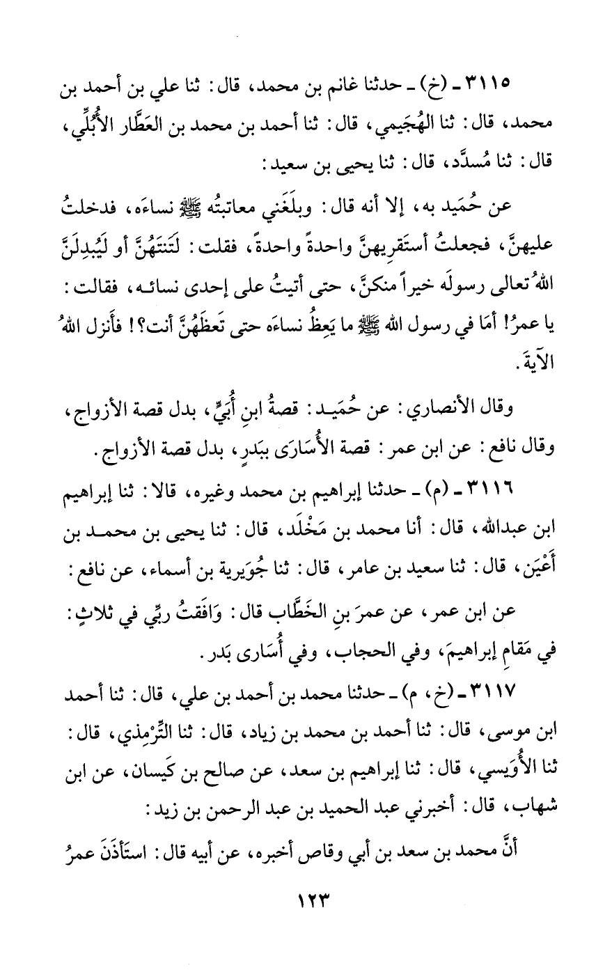 وقال الأنصاري: عن حميد: قصة ابن أبي، بدل قصة الأزواج، وقال نافع: عن ابن عمر: قصة الأسارى ببدر، بدل قصة الأزواج.