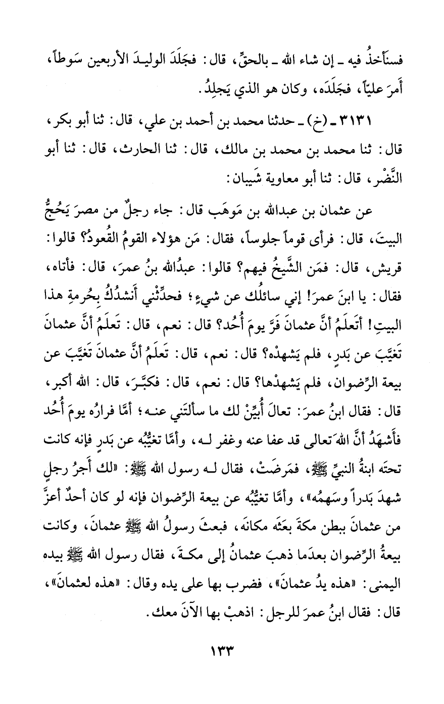 عن عثمان بن عبد الله بن موهب قال: جاء رجل من مصر يحج البيت، قال: فرأى قوما جلوسا، فقال: من هؤلاء القوم القعود؟ قالوا: قريش، قال: فمن الشيخ فيهم؟ قالوا: عبد الله بن عمر، قال: فأتاه، فقال: يا ابن عمر! إني سائلك عن شيء؛ فحدثني أنشدك بحرمة هذا البيت! أتعلم أن عثمان فر يوم أحد؟ قال: نعم، قال: تعلم أن عثمان تغيب عن بدر، فلم يشهده؟ قال: نعم، قال: تعلم أن عثمان تغيب عن بيعة الرضوان، فلم يشهدها؟ قال: نعم، قال: فكبر، قال: الله أكبر، قال: فقال ابن عمر: تعال أبين لك ما سألتني عنه؛ أما فراره يوم أحد فأشهد أن الله تعالى قد عفا عنه وغفر له، وأما تغيبه عن بدر فإنه كانت تحته ابنة النبي صلى الله عليه وسلم، فمرضت، فقال له رسول الله صلى الله عليه وسلم: ((لك أجر رجل شهد بدرا وسهمه))، وأما تغيبه عن بيعة الرضوان فإنه لو كان أحد أعز من عثمان ببطن مكة بعثه مكانه، فبعث رسول الله صلى الله عليه وسلم عثمان، وكانت بيعة الرضوان بعدما ذهب عثمان إلى مكة، فقال رسول الله صلى الله عليه وسلم بيده اليمنى: ((هذه يد عثمان))، فضرب بها على يده وقال: ((هذه لعثمان))، قال: فقال ابن عمر للرجل: اذهب بها الآن معك.