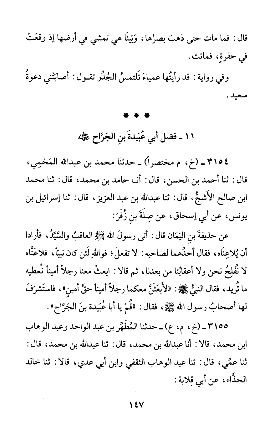 3154 - (خ، م مختصرا) - حدثنا محمد بن عبد الله المحمي، قال: ثنا أحمد بن الحسن، قال: أنا حامد بن محمد، قال: ثنا محمد بن صالح الأشج، قال: ثنا عبد الله بن عبد العزيز، قال: ثنا إسرائيل بن يونس، عن أبي إسحاق، عن صلة بن زفر: