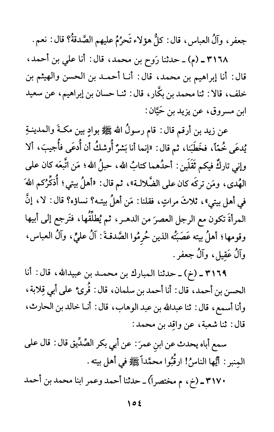 عن زيد بن أرقم قال: قام رسول الله صلى الله عليه وسلم بواد بين مكة والمدينة يدعى خما، فخطبنا، ثم قال: ((إنما أنا بشر أوشك أن أدعى فأجيب، ألا وإني تارك فيكم ثقلين: أحدهما كتاب الله، حبل الله؛ من اتبعه كان على الهدى، ومن تركه كان على الضلالة))، ثم قال: ((أهل بيتي؛ أذكركم الله في أهل بيتي))، ثلاث مرات، فقلنا: من أهل بيته؟ نساؤه؟ قال: لا، إن المرأة تكون مع الرجل العصر من الدهر، ثم يطلقها، فترجع إلى أبيها وقومها؛ أهل بيته عصبته الذين حرموا الصدقة: آل علي، وآل العباس، وآل عقيل، وآل جعفر.