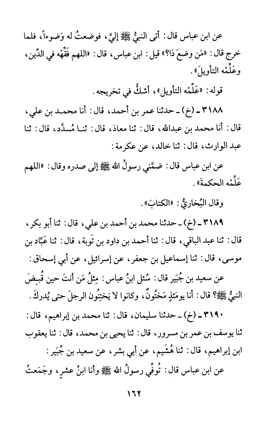 3188 - (خ) - حدثنا عمر بن أحمد، قال: أنا محمد بن علي، قال: أنا محمد بن عبد الله، قال: ثنا معاذ، قال: ثنا مسدد، قال: ثنا عبد الوارث، قال: ثنا خالد، عن عكرمة: