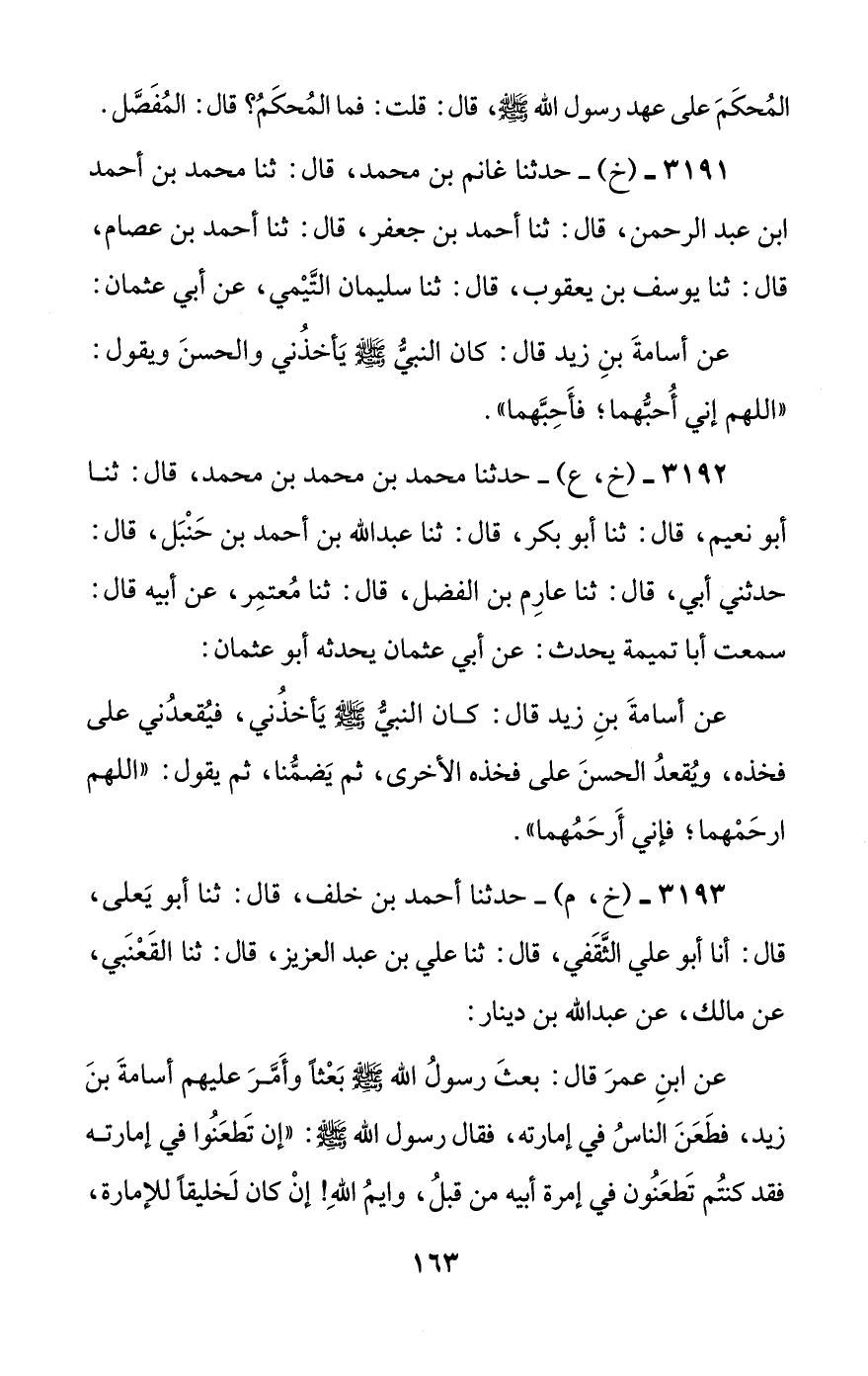 عن ابن عمر قال: بعث رسول الله صلى الله عليه وسلم بعثا وأمر عليهم أسامة بن زيد، فطعن الناس في إمارته، فقال رسول الله صلى الله عليه وسلم: ((إن تطعنوا في إمارته فقد كنتم تطعنون في إمرة أبيه من قبل، وايم الله! إن كان لخليقا للإمارة، #164# وإن كان أبوه من أحب الناس إلي، وإن هذا من أحب الناس إلي بعده)).