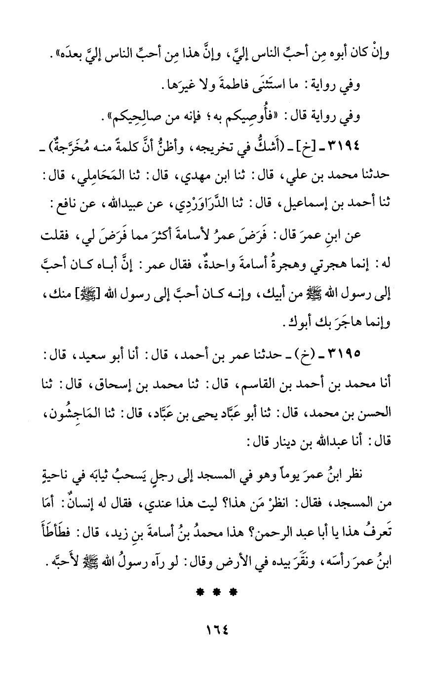 3194 - [خ]- (أشك في تخريجه، وأظن أن كلمة منه مخرجة) - حدثنا محمد بن علي، قال: ثنا ابن مهدي، قال: ثنا المحاملي، قال: ثنا أحمد بن إسماعيل، قال: ثنا الدراوردي، عن عبيد الله، عن نافع: