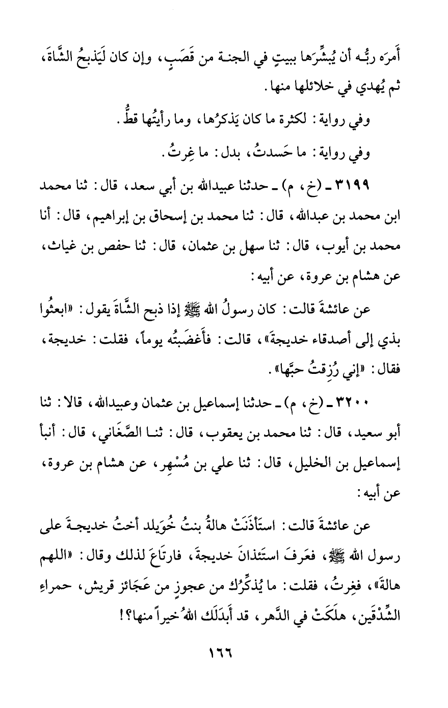 3200 - (خ، م) - حدثنا إسماعيل بن عثمان وعبيد الله، قالا: ثنا أبو سعيد، قال: ثنا محمد بن يعقوب، قال: ثنا الصغاني، قال: أنبأ إسماعيل بن الخليل، قال: ثنا علي بن مسهر، عن هشام بن عروة، عن أبيه:
