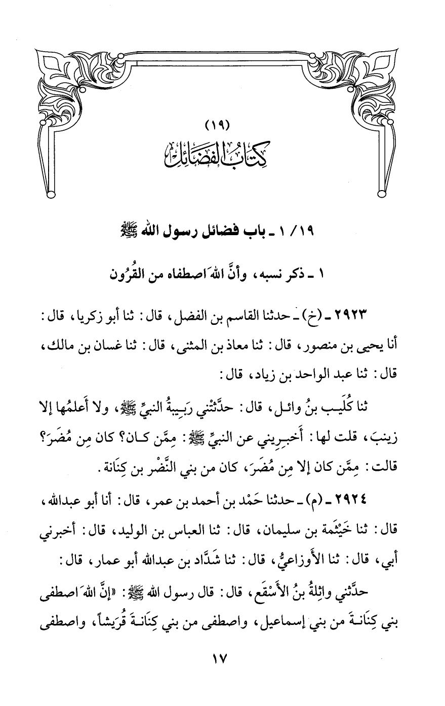 حدثني واثلة بن الأسقع، قال: قال رسول الله صلى الله عليه وسلم: ((إن الله اصطفى بني كنانة من بني إسماعيل، واصطفى من بني كنانة قريشا، واصطفى #18# من قريش بني هاشم، واصطفاني من بني هاشم)) صلى الله عليه وسلم.