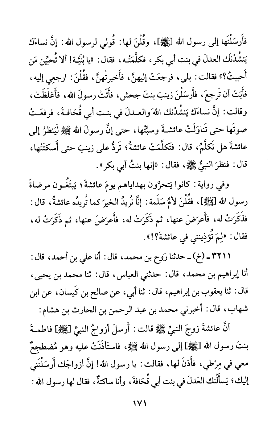 أن عائشة زوج النبي صلى الله عليه وسلم قالت: أرسل أزواج النبي [صلى الله عليه وسلم] فاطمة بنت رسول الله [صلى الله عليه وسلم] إلى رسول الله صلى الله عليه وسلم، فاستأذنت عليه وهو مضطجع معي في مرطي، فأذن لها، فقالت: يا رسول الله! إن أزواجك أرسلنني إليك؛ يسألنك العدل في بنت أبي قحافة، وأنا ساكتة، فقال لها رسول الله: #172# ((أي بنية! ألست تحبين ما أحب؟)) قالت: بلى، قال: ((فأحبي هذه))، فقامت فاطمة حين سمعت ذلك من رسول الله صلى الله عليه وسلم، فرجعت إلى أزواج النبي صلى الله عليه وسلم، فأخبرتهن بالذي قالت وبالذي قال لها رسول الله [صلى الله عليه وسلم]، فقلن لها: ما نراك أغنيت عنا من شيء؛ فارجعي إلى رسول الله [صلى الله عليه وسلم]، فقولي له: إن أزواجك ينشدنك العدل في بنت أبي قحافة، فقالت فاطمة: والله لا أكلمه فيها أبدا، قالت عائشة: فأرسل أزواج النبي [صلى الله عليه وسلم] إلي زينب بنت جحش زوج النبي صلى الله عليه وسلم، وهي التي كانت تساميني فيهن من المنزلة عند رسول الله [صلى الله عليه وسلم]، ولم أر امرأة قط خيرا في الدين من زينب، وأتقى لله، وأصدق حديثا، وأوصل للرحم، وأعظم صدقة، وأشد ابتذالا لنفسها في العمل بالذي تصدق به وتقرب به إلى الله عز وجل؛ ما عدا سورة من حدة كانت فيها تسرع منها الفيئة، قالت: فاستأذنت على رسول الله [صلى الله عليه وسلم]، و رسول الله [صلى الله عليه وسلم] مع عائشة في مرطها على الحال التي دخلت فاطمة عليها وهو بها، فأذن لها رسول الله [صلى الله عليه وسلم] فقالت: يا رسول الله! إن أزواجك أرسلنني إليك؛ يسألنك العدل في بنت أبي قحافة، قالت: ثم وقعت بي، فاستطالت علي، وأنا أرقب رسول الله [صلى الله عليه وسلم] وأرقب طرفه؛ هل يأذن لي فيها؟ قالت: فلم تبرح زينب حتى عرفت أن رسول الله صلى الله عليه وسلم لا يكره أن أنتصر، قالت: فلما وقعت بها لم أنشبها حتى أنحيت عليها، فقال رسول الله صلى الله عليه وسلم وتبسم: ((إنها بنت أبي بكر)).