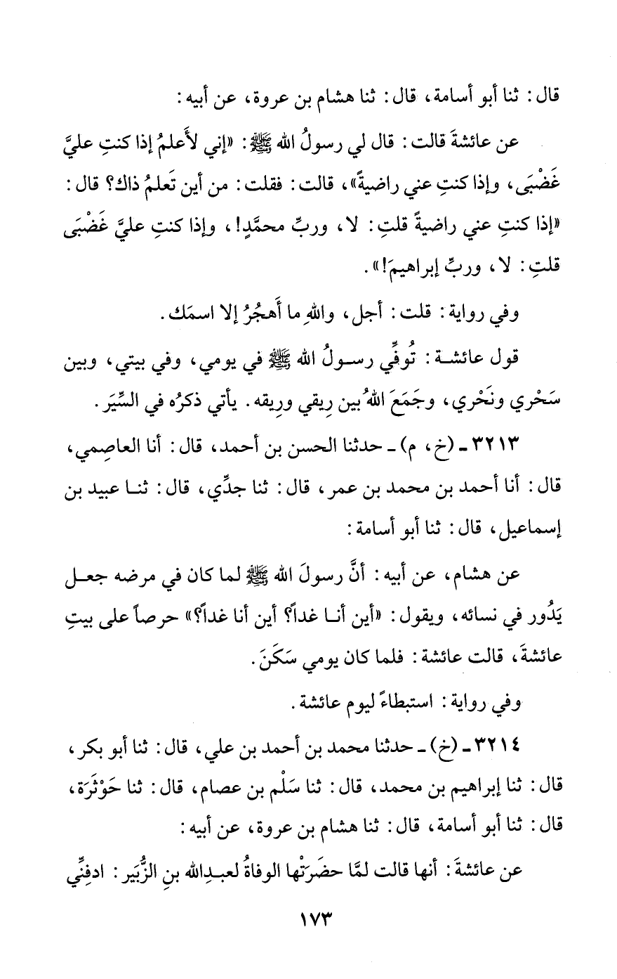 3214 - (خ) - حدثنا محمد بن أحمد بن علي، قال: ثنا أبو بكر، قال: ثنا إبراهيم بن محمد، قال: ثنا سلم بن عصام، قال: ثنا حوثرة، قال: ثنا أبو أسامة، قال: ثنا هشام بن عروة، عن أبيه: