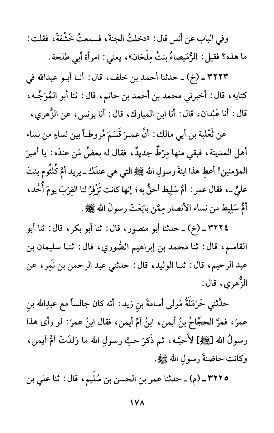 3224 - (خ) - حدثنا أبو منصور، قال: ثنا أبو بكر، قال: ثنا أبو القاسم، قال: ثنا محمد بن إبراهيم الصوري، قال: ثنا سليمان بن عبد الرحيم، قال: ثنا الوليد، قال: حدثني عبد الرحمن بن نمر، عن الزهري، قال: