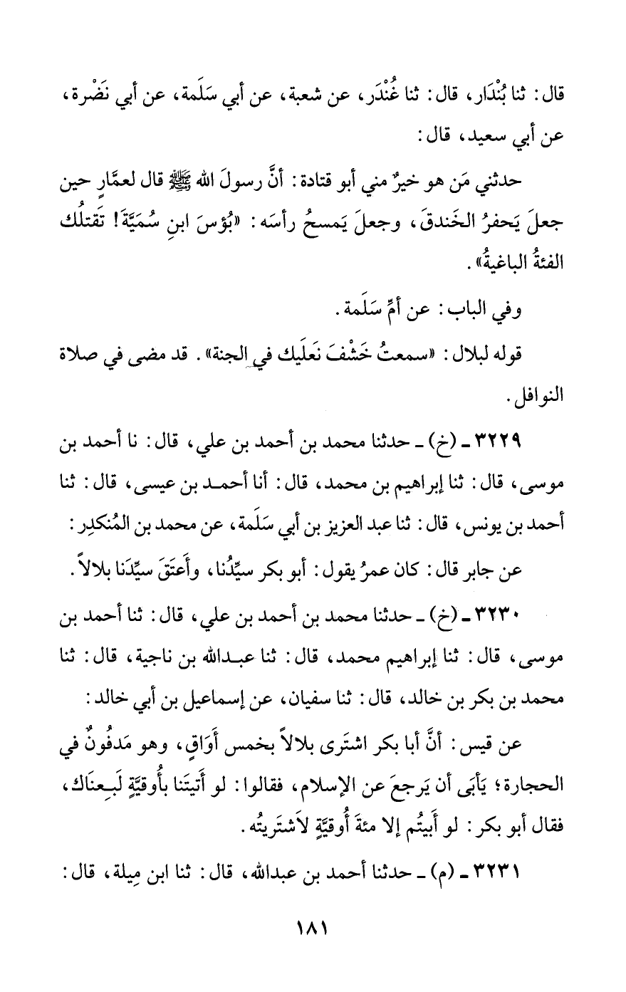 3230 - (خ) - حدثنا محمد بن أحمد بن علي، قال: ثنا أحمد بن موسى، قال: ثنا إبراهيم محمد، قال: ثنا عبد الله بن ناجية، قال: ثنا محمد بن بكر بن خالد، قال: ثنا سفيان، عن إسماعيل بن أبي خالد: