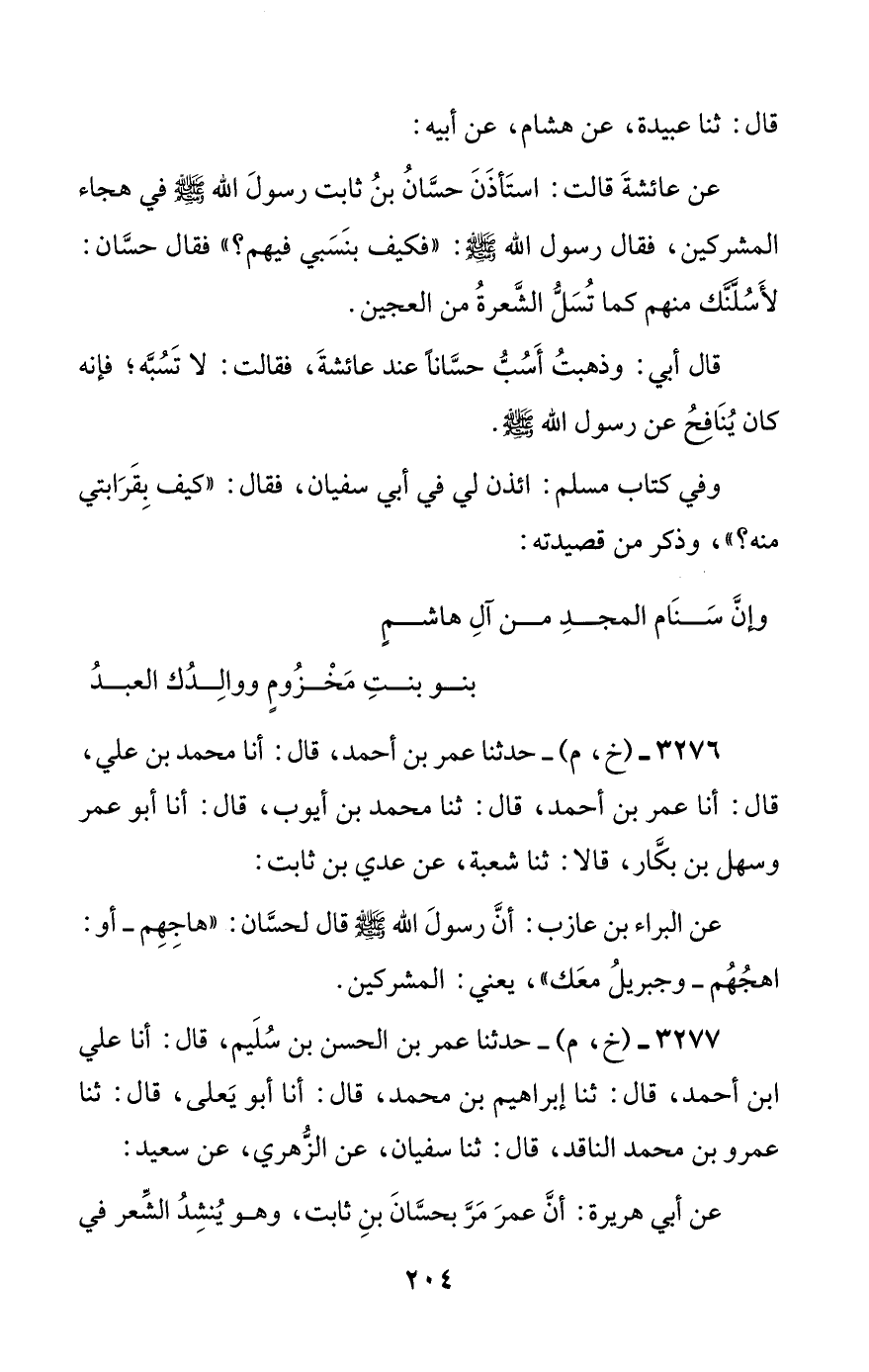 عن أبي هريرة: أن عمر مر بحسان بن ثابت، وهو ينشد الشعر في #205# المسجد، فلحظ إليه، فقال: قد كنت أنشد فيه، وفيه من هو خير منك، ثم التفت إلى أبي هريرة، فقال: أنشدك بالله! أسمعت رسول الله صلى الله عليه وسلم يقول: ((أجب عني؛ اللهم أيده بروح القدس))؟ فقال: اللهم نعم.