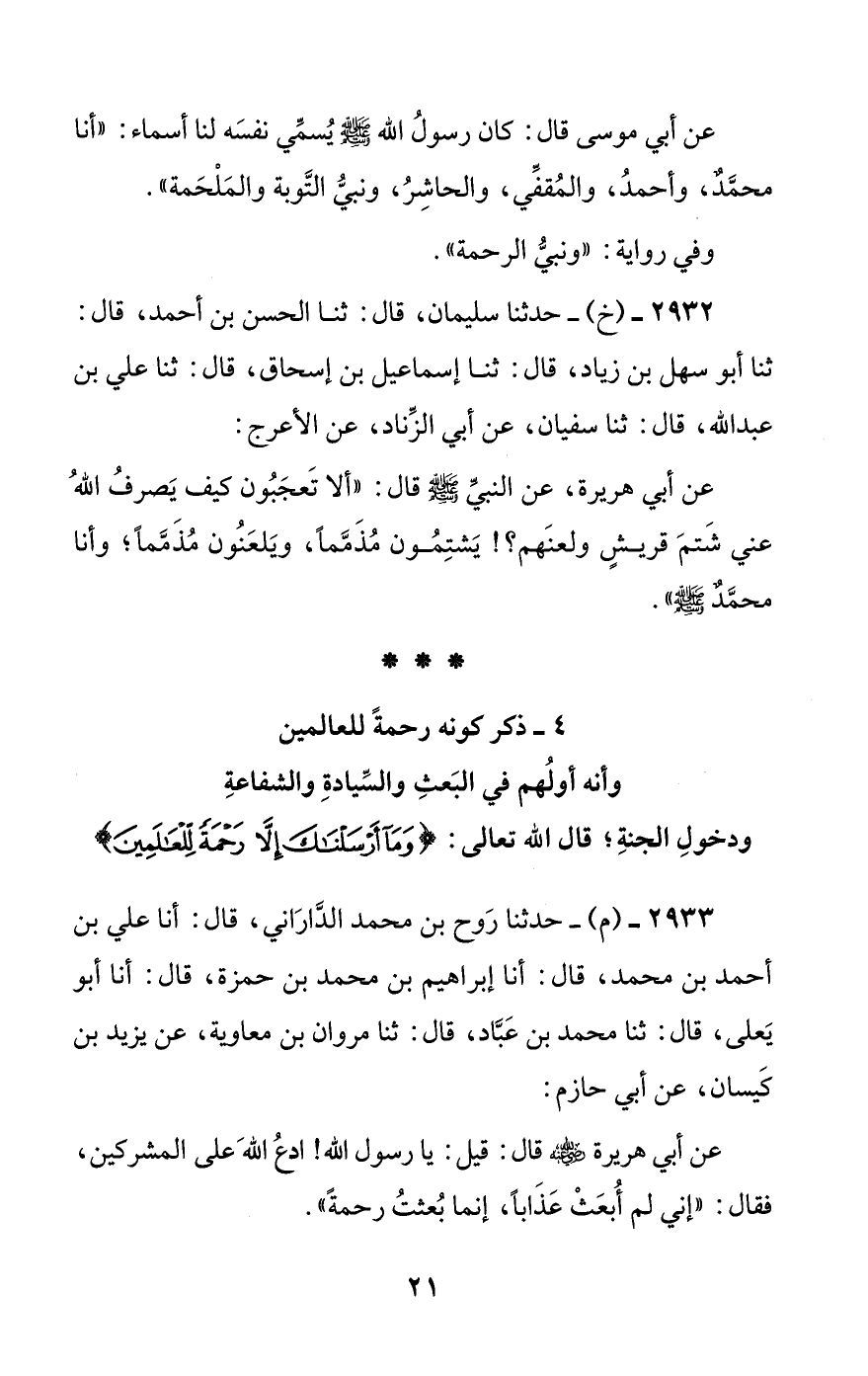 [4] ذكر كونه رحمة للعالمين وأنه أولهم في البعث والسيادة والشفاعة ودخول الجنة؛ قال الله تعالى: {وما أرسلناك إلا رحمة للعالمين}