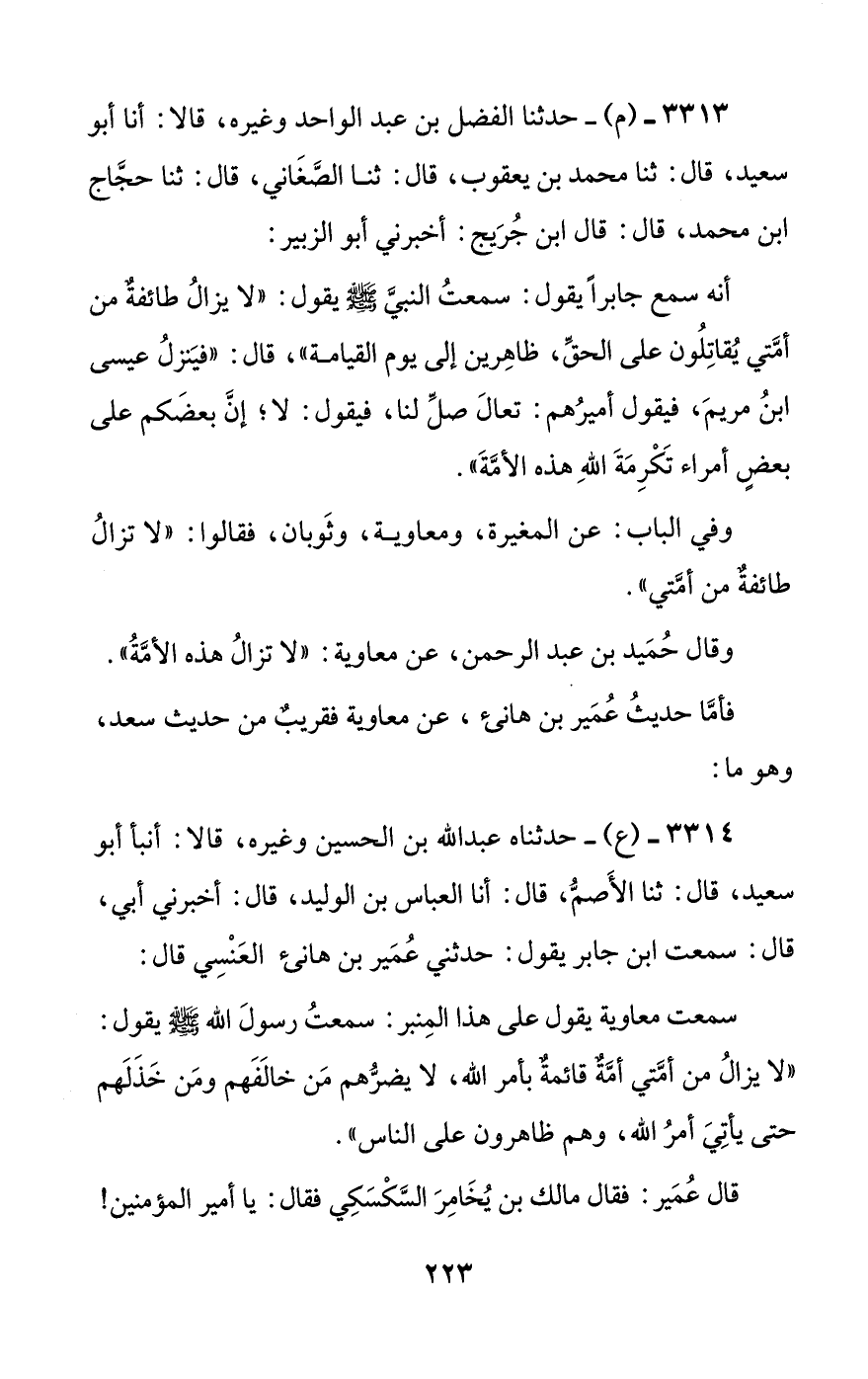 3314 - (ع) - حدثناه عبد الله بن الحسين وغيره، قالا: أنبأ أبو سعيد، قال: ثنا الأصم، قال: أنا العباس بن الوليد، قال: أخبرني أبي، قال: سمعت ابن جابر يقول: حدثني عمير بن هانئ العنسي قال: