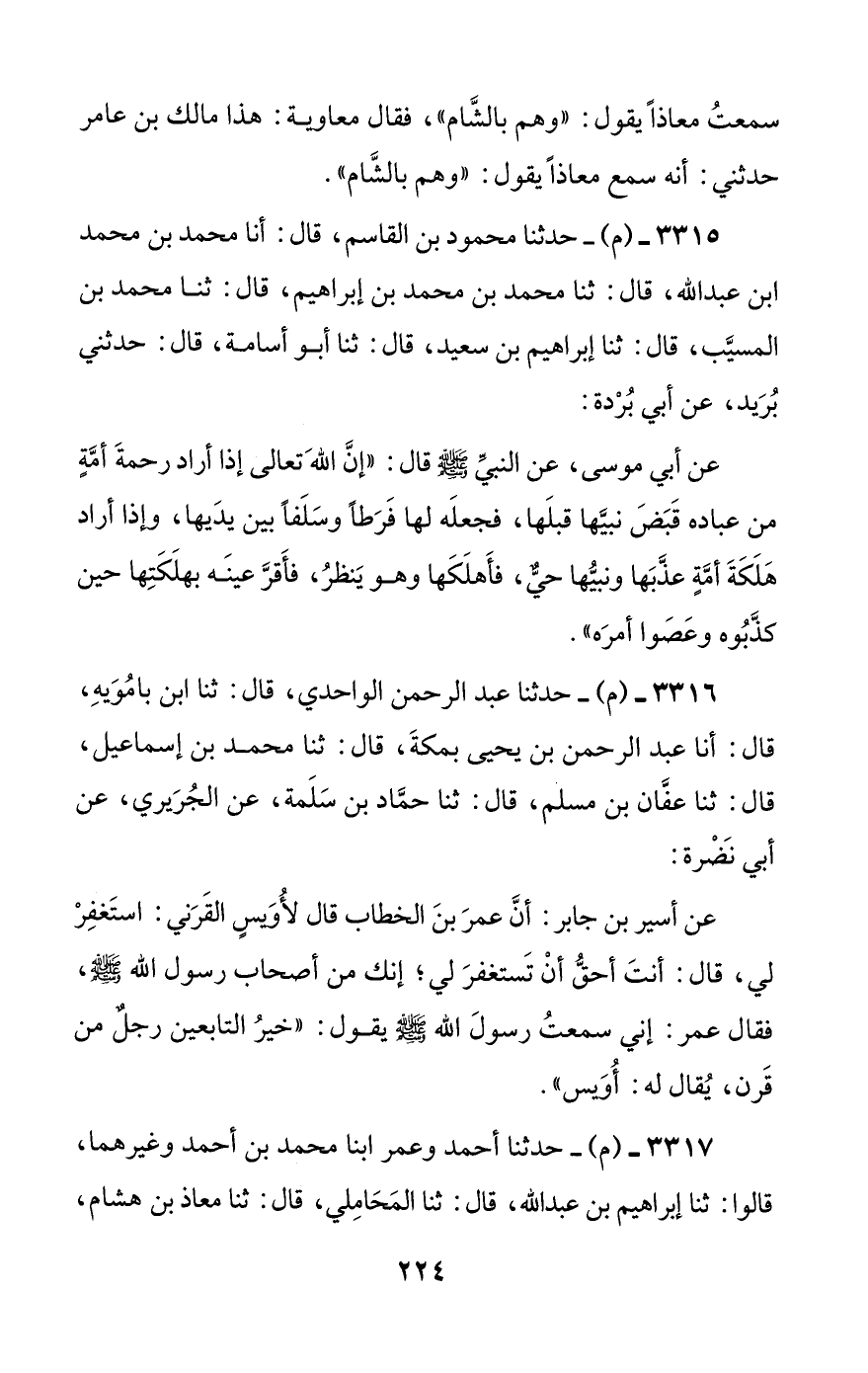 3317 - (م) - حدثنا أحمد وعمر ابنا محمد بن أحمد وغيرهما، قالوا: ثنا إبراهيم بن عبد الله، قال: ثنا المحاملي، قال: ثنا معاذ بن هشام، #225# قال: حدثني أبي، عن قتادة، عن زرارة بن أوفى،