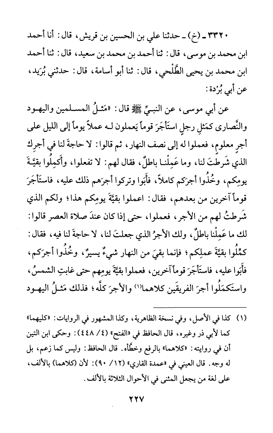 عن أبي موسى، عن النبي صلى الله عليه وسلم قال: ((مثل المسلمين واليهود والنصارى كمثل رجل استأجر قوما يعملون له عملا يوما إلى الليل على أجر معلوم، فعملوا له إلى نصف النهار، ثم قالوا: لا حاجة لنا في أجرك الذي شرطت لنا، وما عملنا باطل، فقال لهم: لا تفعلوا، وأكملوا بقية يومكم، وخذوا أجركم كاملا، فأبوا وتركوا أجرهم ذلك عليه، فاستأجر قوما آخرين من بعدهم، فقال: اعملوا بقية يومكم هذا؛ ولكم الذي شرطت لهم من الأجر، فعملوا، حتى إذا كان عند صلاة العصر قالوا: لك ما عملنا باطل، ولك الأجر الذي جعلت لنا، لا حاجة لنا فيه، فقال: كملوا بقية عملكم؛ فإنما بقي من النهار شيء يسير، وخذوا أجركم، فأبوا عليه، فاستأجر قوما آخرين، فعملوا بقية يومهم حتى غابت الشمس، واستكملوا أجر الفريقين كلاهما والأجر كله؛ فذلك مثل اليهود #228# والنصارى والذين تركوا ما أمرهم الله تعالى به، ومثل المسلمين ومثل ما قبلوا من هذا النور)).