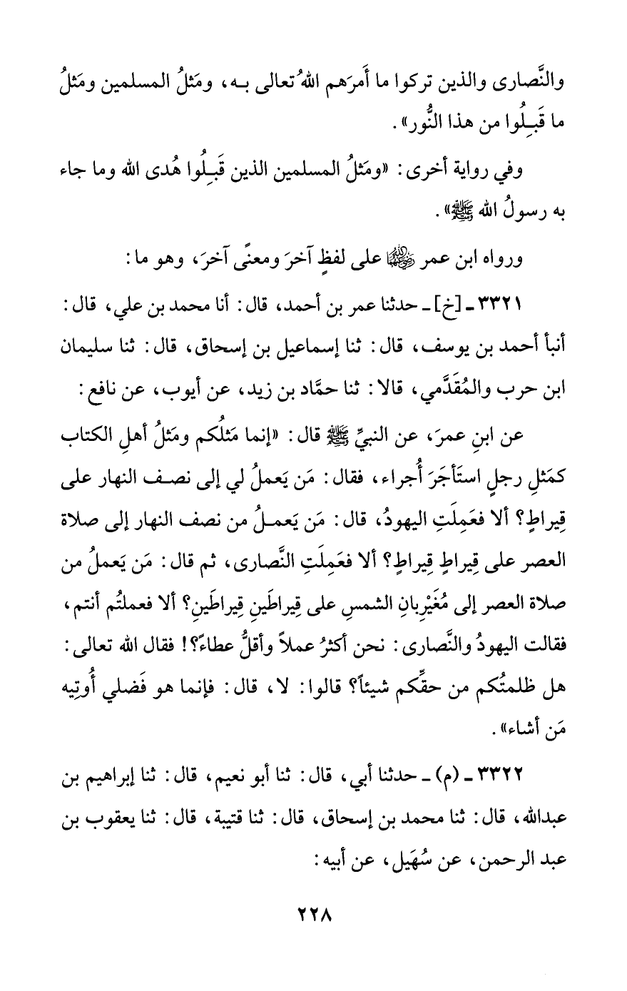 3321 - [خ]- حدثنا عمر بن أحمد، قال: أنا محمد بن علي، قال: أنبأ أحمد بن يوسف، قال: ثنا إسماعيل بن إسحاق، قال: ثنا سليمان بن حرب والمقدمي، قالا: ثنا حماد بن زيد، عن أيوب، عن نافع: