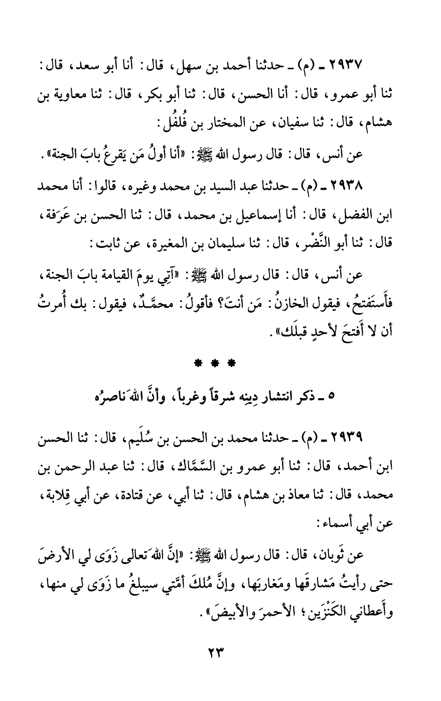 2938 - (م) - حدثنا عبد السيد بن محمد وغيره، قالوا: أنا محمد بن الفضل، قال: أنا إسماعيل بن محمد، قال: ثنا الحسن بن عرفة، قال: ثنا أبو النضر، قال: ثنا سليمان بن المغيرة، عن ثابت: