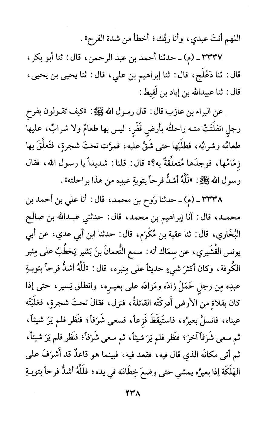 3338 - (م) - حدثنا روح بن محمد، قال: أنا علي بن أحمد بن محمد، قال: أنا إبراهيم بن محمد، قال: حدثني عبد الله بن صالح البخاري، قال: ثنا عقبة بن مكرم، قال: حدثنا ابن أبي عدي، عن أبي يونس القشيري، عن سماك أنه: سمع النعمان بن بشير يخطب على منبر الكوفة، وكان أكثر شيء حديثا على منبره، قال: ((لله أشد فرحا بتوبة عبده من رجل حمل زاده ومزاده على بعيره، وانطلق يسير، حتى إذا كان بفلاة من الأرض أدركته القائلة، فنزل، فقال تحت شجرة، فغلبته عيناه، فانسل بعيره، فاستيقظ فزعا، فسعى شرفا؛ فنظر فلم ير شيئا، ثم سعى شرفا آخر؛ فنظر فلم ير شيئا، ثم سعى شرفا؛ فنظر فلم ير شيئا، ثم أتى مكانه الذي قال فيه، فقعد فيه، فبينما هو قاعد قد أشرف على الهلكة إذا بعيره يمشي حتى وضع خطامه في يده؛ فلله أشد فرحا بتوبة #239# العبد من الرجل حين وجد بعيره على حاله ذلك)).