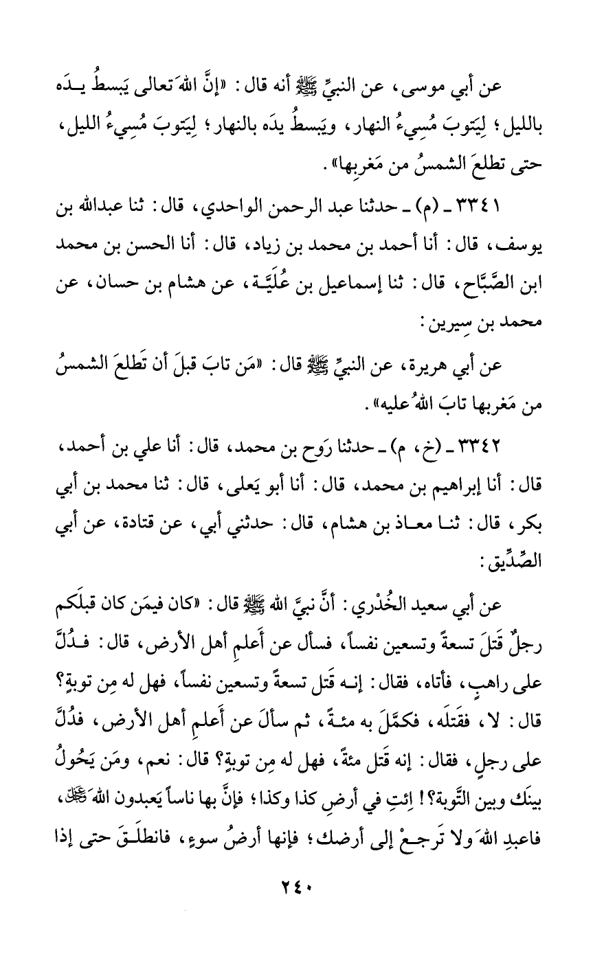 3341 - (م) - حدثنا عبد الرحمن الواحدي، قال: ثنا عبد الله بن يوسف، قال: أنا أحمد بن محمد بن زياد، قال: أنا الحسن بن محمد بن الصباح، قال: ثنا إسماعيل بن علية، عن هشام بن حسان، عن محمد بن سيرين: