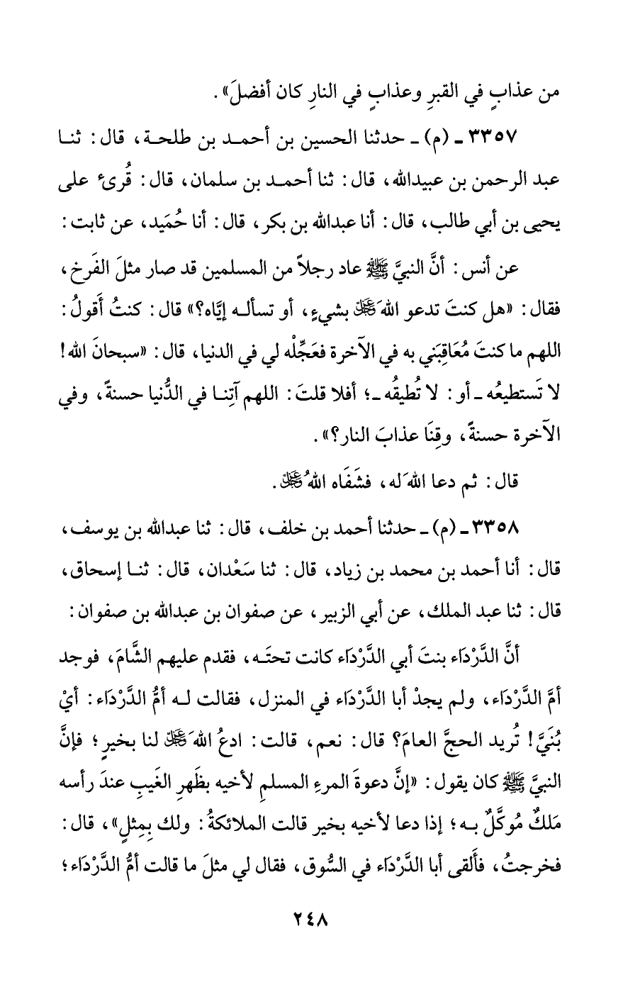 3357 - (م) - حدثنا الحسين بن أحمد بن طلحة، قال: ثنا عبد الرحمن بن عبيد الله، قال: ثنا أحمد بن سلمان، قال: قرئ على يحيى بن أبي طالب، قال: أنا عبد الله بن بكر، قال: أنا حميد، عن ثابت: