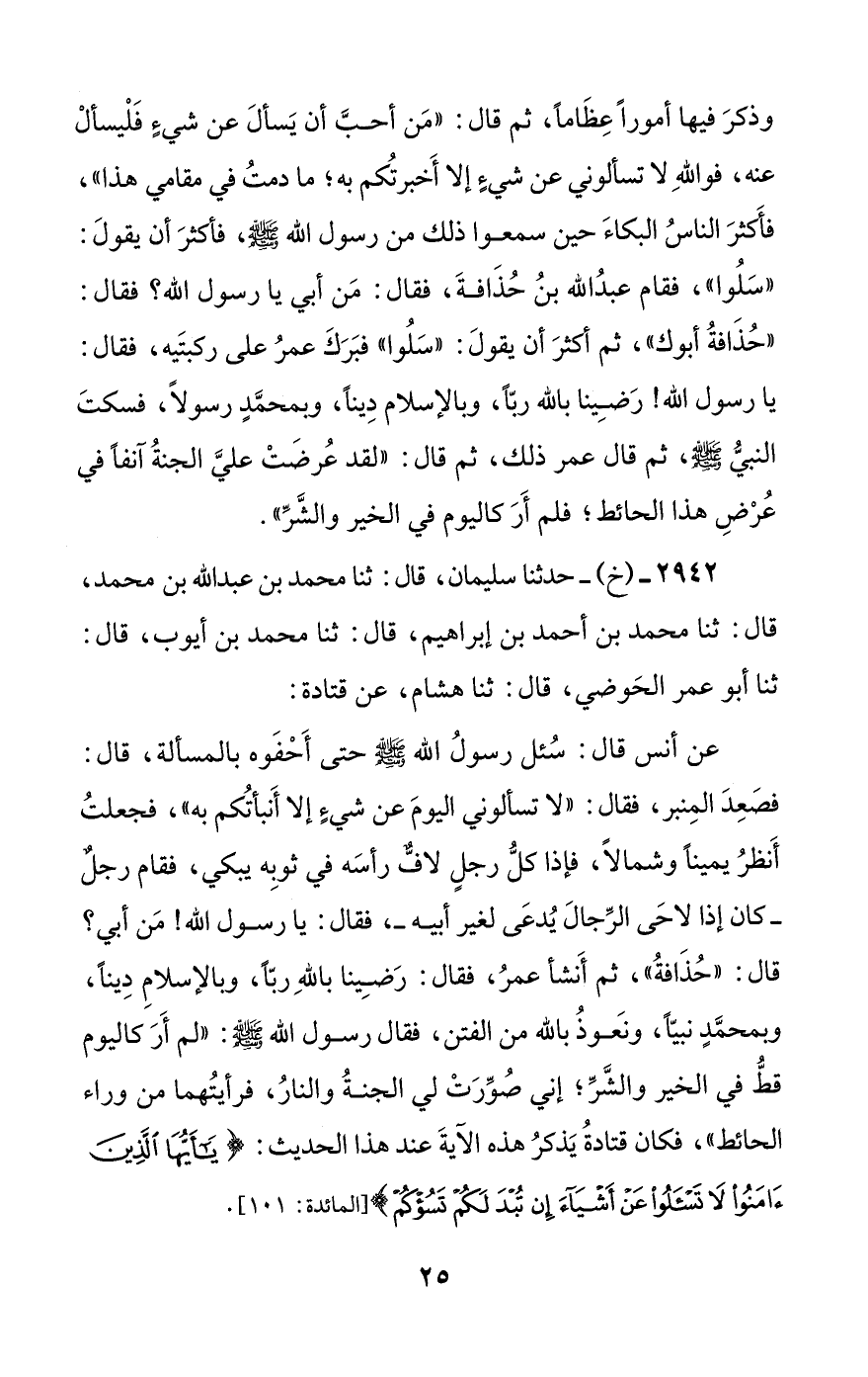 عن أنس قال: سئل رسول الله صلى الله عليه وسلم حتى أحفوه بالمسألة، قال: فصعد المنبر، فقال: ((لا تسألوني اليوم عن شيء إلا أنبأتكم به))، فجعلت أنظر يمينا وشمالا، فإذا كل رجل لاف رأسه في ثوبه يبكي، فقام رجل -كان إذا لاحى الرجال يدعى لغير أبيه-، فقال: يا رسول الله! من أبي؟ قال: ((حذافة))، ثم أنشأ عمر، فقال: رضينا بالله ربا، وبالإسلام دينا، وبمحمد نبيا، ونعوذ بالله من الفتن، فقال رسول الله صلى الله عليه وسلم: ((لم أر كاليوم قط في الخير والشر؛ إني صورت لي الجنة والنار، فرأيتهما من وراء الحائط))، فكان قتادة يذكر هذه الآية عند هذا الحديث: {يأيها الذين آمنوا لا تسئلوا عن أشياء إن تبد لكم تسؤكم}.