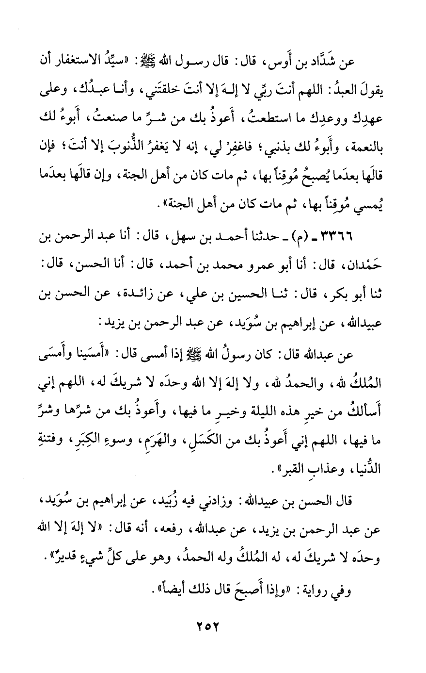 عن عبد الله قال: كان رسول الله صلى الله عليه وسلم إذا أمسى قال: ((أمسينا وأمسى الملك لله، والحمد لله، ولا إله إلا الله وحده لا شريك له، اللهم إني أسألك من خير هذه الليلة وخير ما فيها، وأعوذ بك من شرها وشر ما فيها، اللهم إني أعوذ بك من الكسل، والهرم، وسوء الكبر، وفتنة الدنيا، وعذاب القبر)).