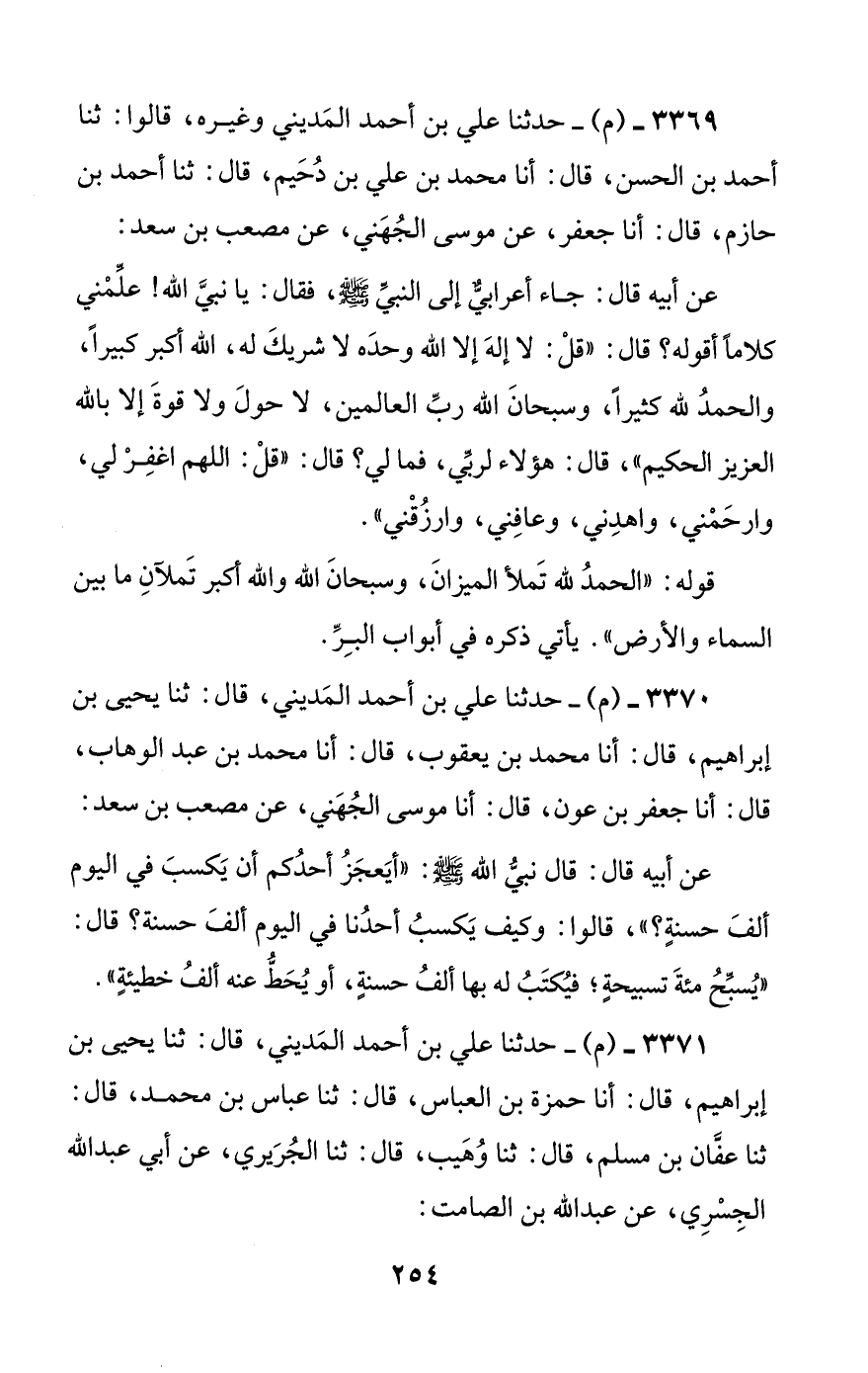 3370 - (م) - حدثنا علي بن أحمد المديني، قال: ثنا يحيى بن إبراهيم، قال: أنا محمد بن يعقوب، قال: أنا محمد بن عبد الوهاب، قال: أنا جعفر بن عون، قال: أنا موسى الجهني، عن مصعب بن سعد: