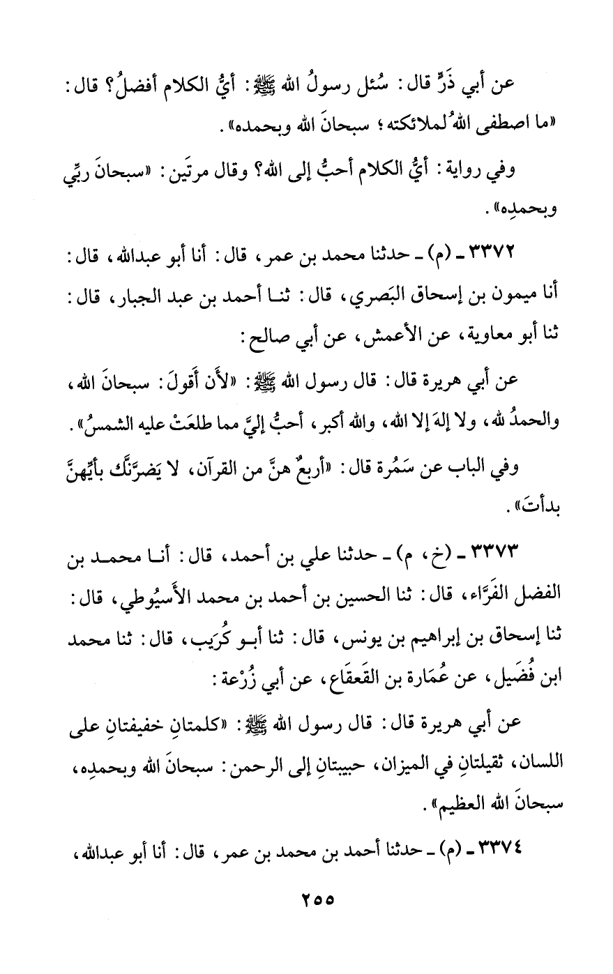 3373 - (خ، م) - حدثنا علي بن أحمد، قال: أنا محمد بن الفضل الفراء، قال: ثنا الحسين بن أحمد بن محمد الأسيوطي، قال: ثنا إسحاق بن إبراهيم بن يونس، قال: ثنا أبو كريب، قال: ثنا محمد بن فضيل، عن عمارة بن القعقاع، عن أبي زرعة: