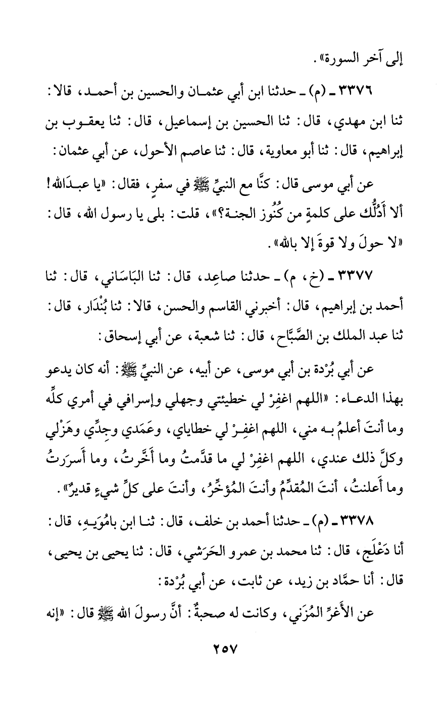 عن أبي موسى قال: كنا مع النبي صلى الله عليه وسلم في سفر، فقال: ((يا عبد الله! ألا أدلك على كلمة من كنوز الجنة؟))، قلت: بلى يا رسول الله، قال: ((لا حول ولا قوة إلا بالله)).
