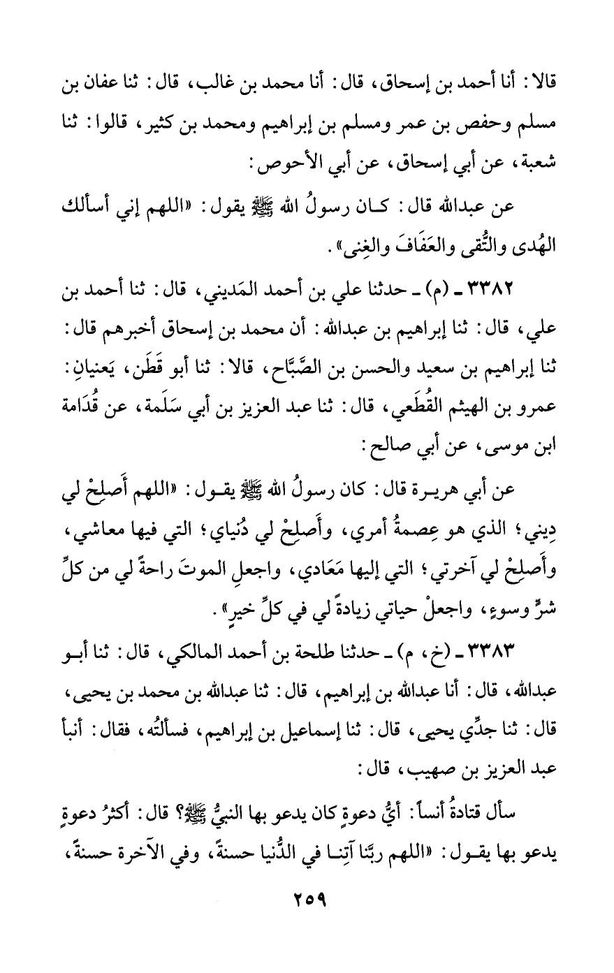3383 - (خ، م) - حدثنا طلحة بن أحمد المالكي، قال: ثنا أبو عبد الله، قال: أنا عبد الله بن إبراهيم، قال: ثنا عبد الله بن محمد بن يحيى، قال: ثنا جدي يحيى، قال: ثنا إسماعيل بن إبراهيم، فسألته، فقال: أنبأ عبد العزيز بن صهيب، قال: