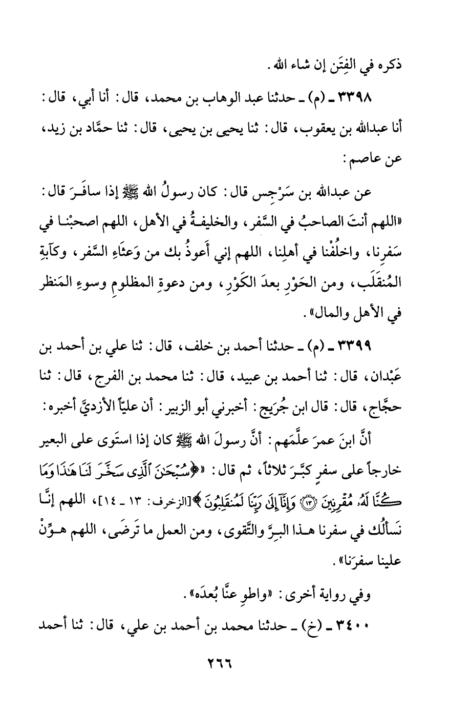 عن عبد الله بن سرجس قال: كان رسول الله صلى الله عليه وسلم إذا سافر قال: ((اللهم أنت الصاحب في السفر، والخليفة في الأهل، اللهم اصحبنا في سفرنا، واخلفنا في أهلنا، اللهم إني أعوذ بك من وعثاء السفر، وكآبة المنقلب، ومن الحور بعد الكور، ومن دعوة المظلوم وسوء المنظر في الأهل والمال)).